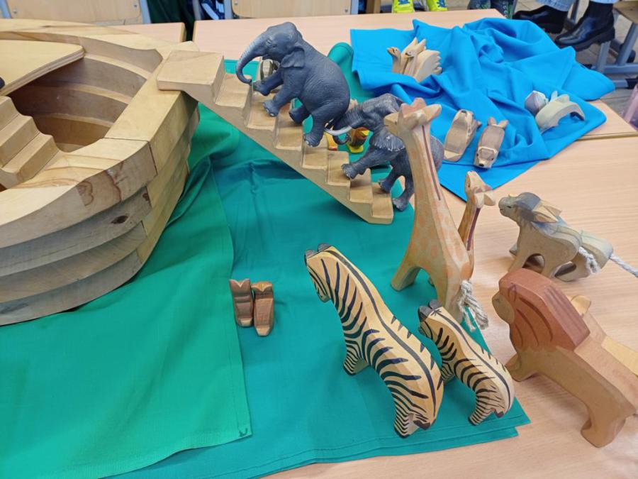 In der 2c ging es im Religionsunterricht um Noah und seine Arche. Dazu hörten die Kinder die Geschichte und stellten sie mit Figuren nach.