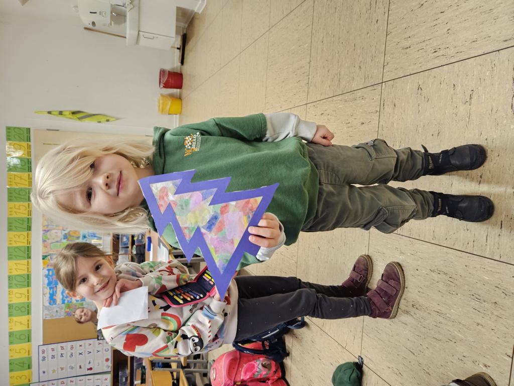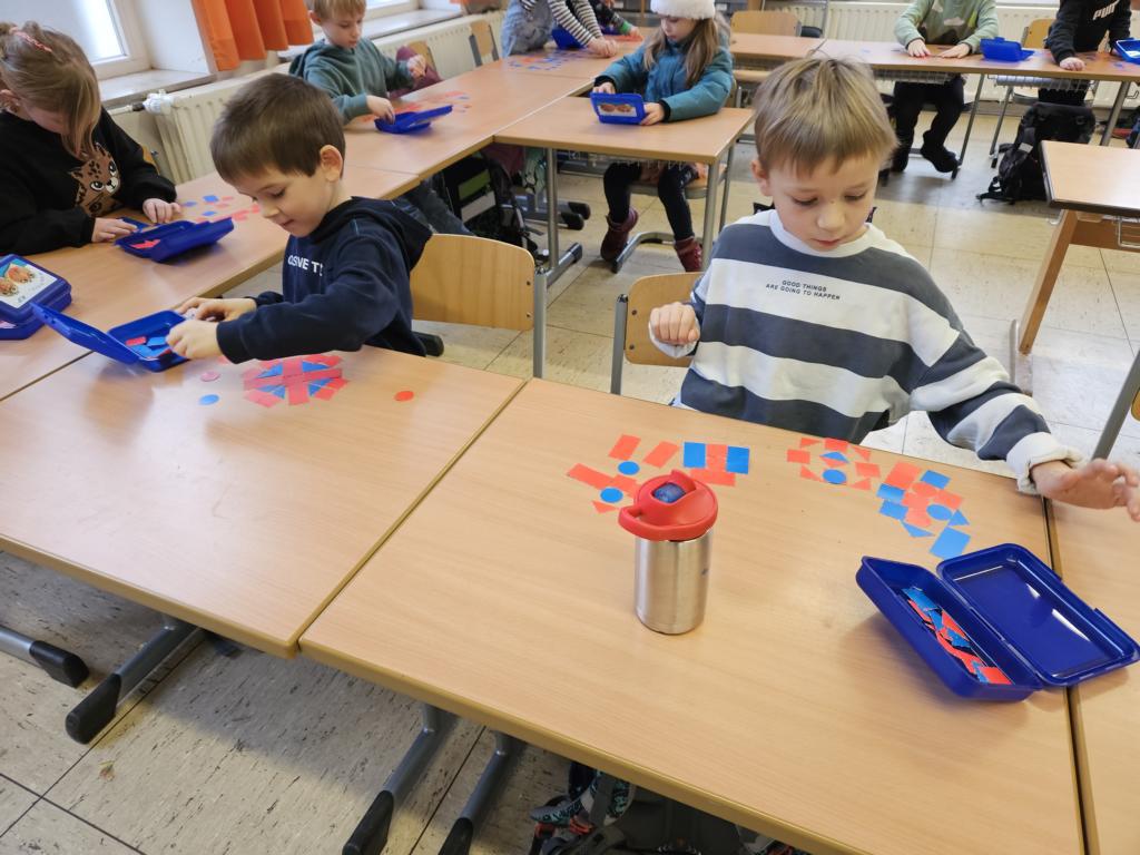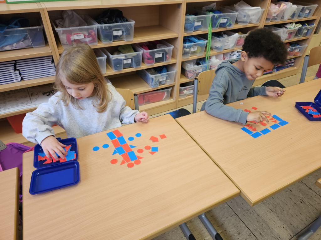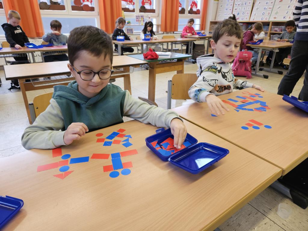 Im Moment arbeiten wir in Mathe nicht mit Zahlen, sondern mit Formen. Wir haben die Formen Kreis, Dreieck, Rechteck und Quadrat kennengelernt. Heute konnten wir eigene Muster oder Figuren legen.