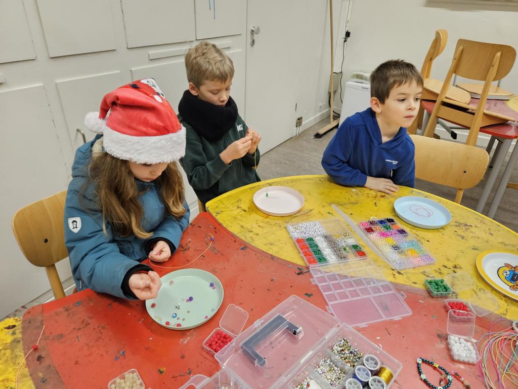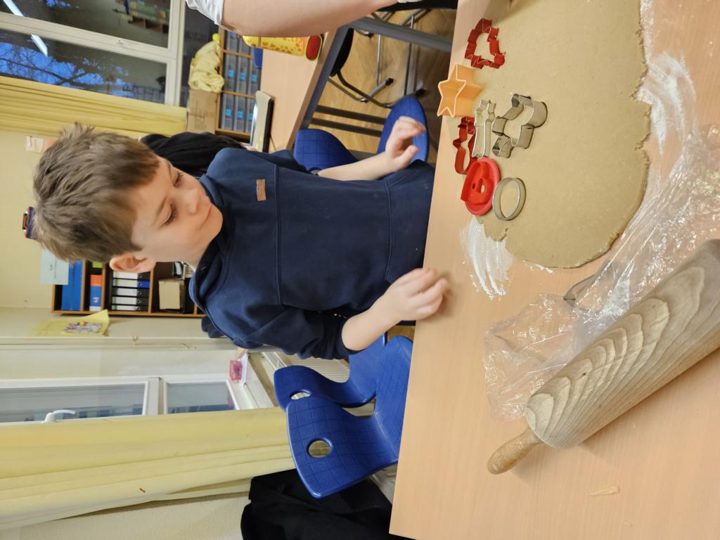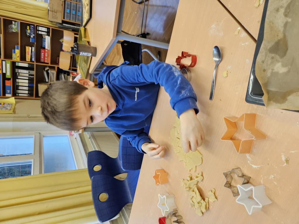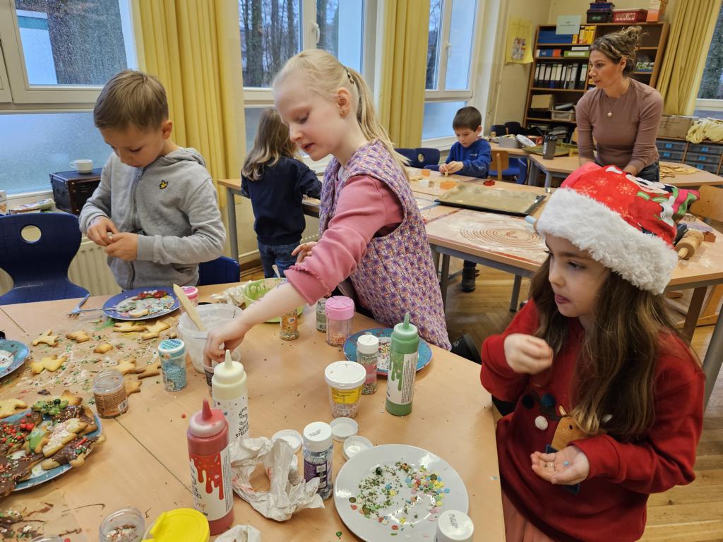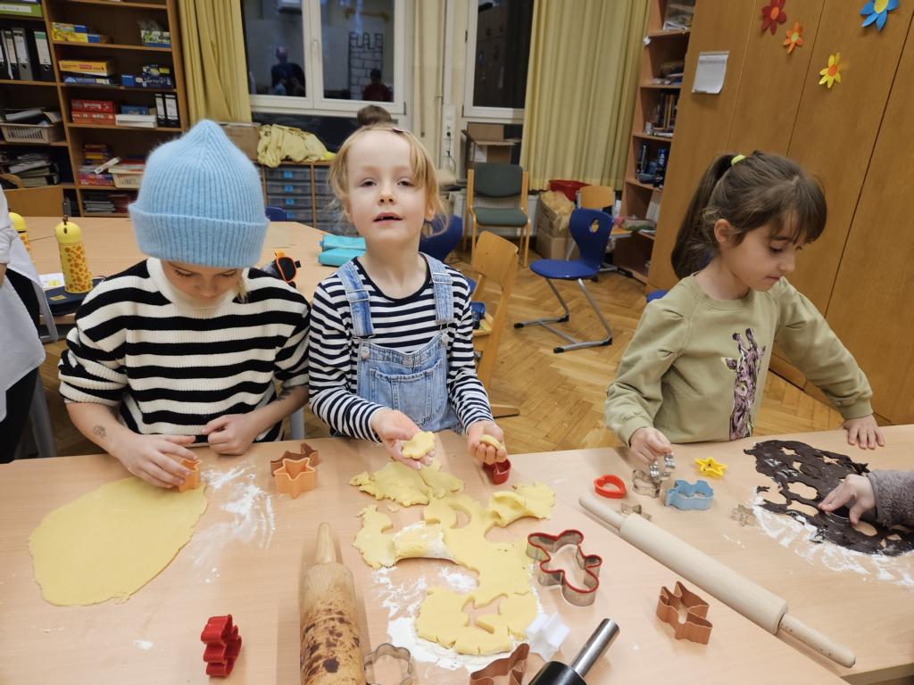 Vier unterschiedliche Aktionen konnten die Kinder in kleinen Gruppen erleben. An einer Station haben die Kinder aus Transparentpapier leichtende Sterne, Schneemänner oder Tannenbäume für die Klassenfenster gezaubert. In einer anderen Gruppe konnten Ketten aus vielen Perlen, Steinen, Sternen, Buchstaben usw. erstellt werden. An einer dritten Station haben die Kinder alles rund um das Backen erlebt, wobei hier kräftig Teig und Kekse genascht werden konnten. An der vierten Station haben die Kinder einen Teil der Geschichte vom Weihnachtszesel gehört und dazu musiziert und gemalt. Zum Schluss durfte jedes Kind einen kleinen Nikolaus mit nach Hause nehmen.