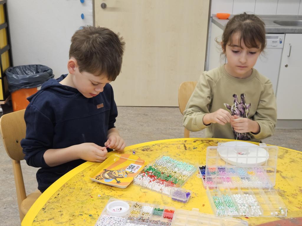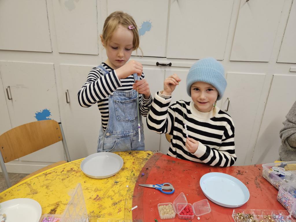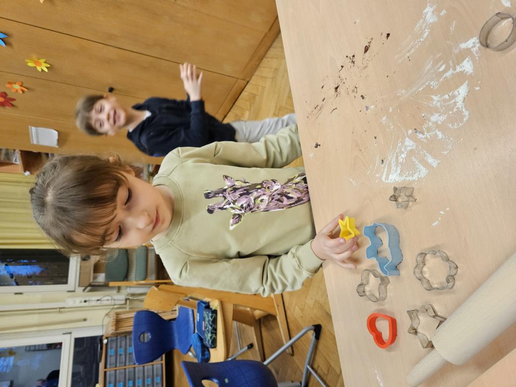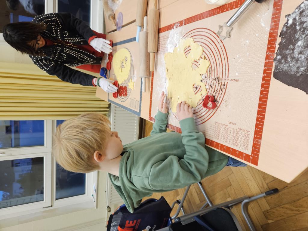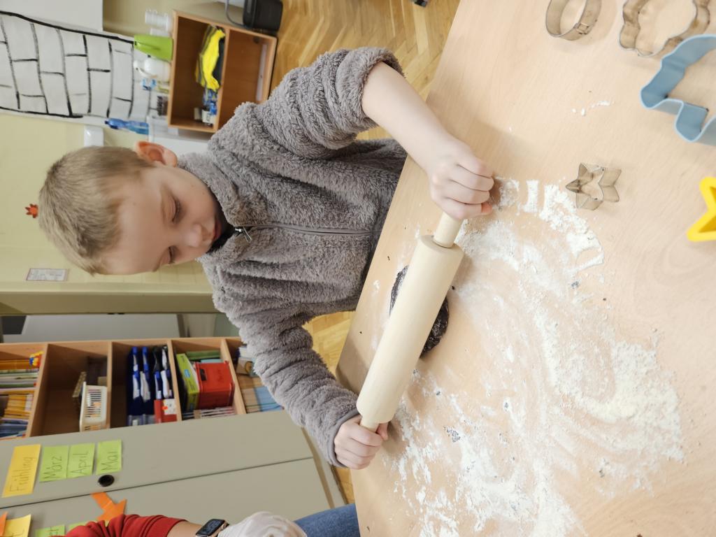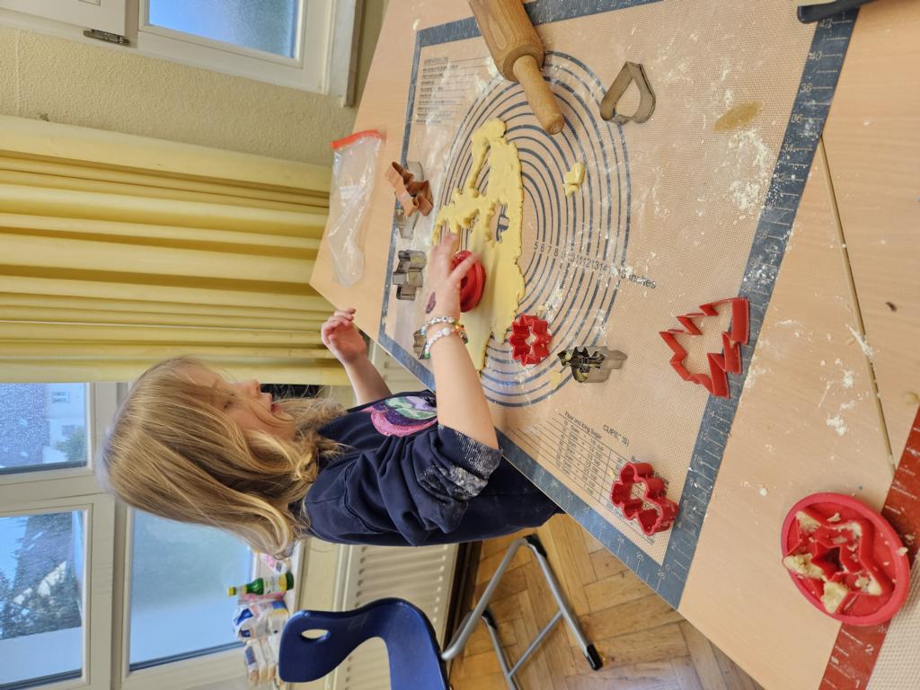 Vier unterschiedliche Aktionen konnten die Kinder in kleinen Gruppen erleben. An einer Station haben die Kinder aus Transparentpapier leichtende Sterne, Schneemänner oder Tannenbäume für die Klassenfenster gezaubert. In einer anderen Gruppe konnten Ketten aus vielen Perlen, Steinen, Sternen, Buchstaben usw. erstellt werden. An einer dritten Station haben die Kinder alles rund um das Backen erlebt, wobei hier kräftig Teig und Kekse genascht werden konnten. An der vierten Station haben die Kinder einen Teil der Geschichte vom Weihnachtszesel gehört und dazu musiziert und gemalt. Zum Schluss durfte jedes Kind einen kleinen Nikolaus mit nach Hause nehmen.