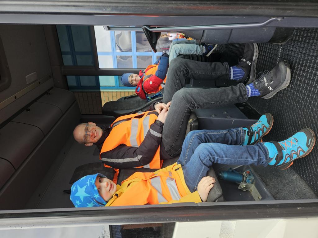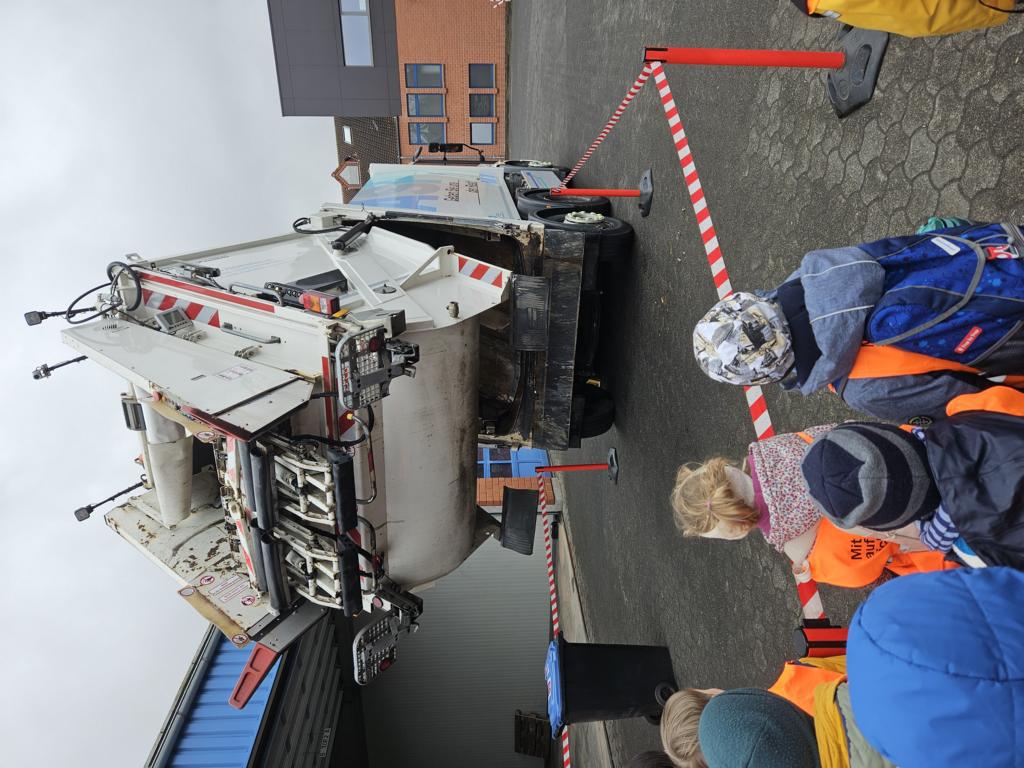 Zum Abschluss durften wir einen Müllwagen ganz aus der Nähe betrachten. Wir sahen, wie die Mülltonnen gekippt werden, und konnten sogar in der Fahrerkabine Platz nehmen. Das absolute Highlight: Wir warfen einen Blick in den riesigen Müllbehälter, als die große Klappe geöffnet wurde – ein beeindruckender Moment!