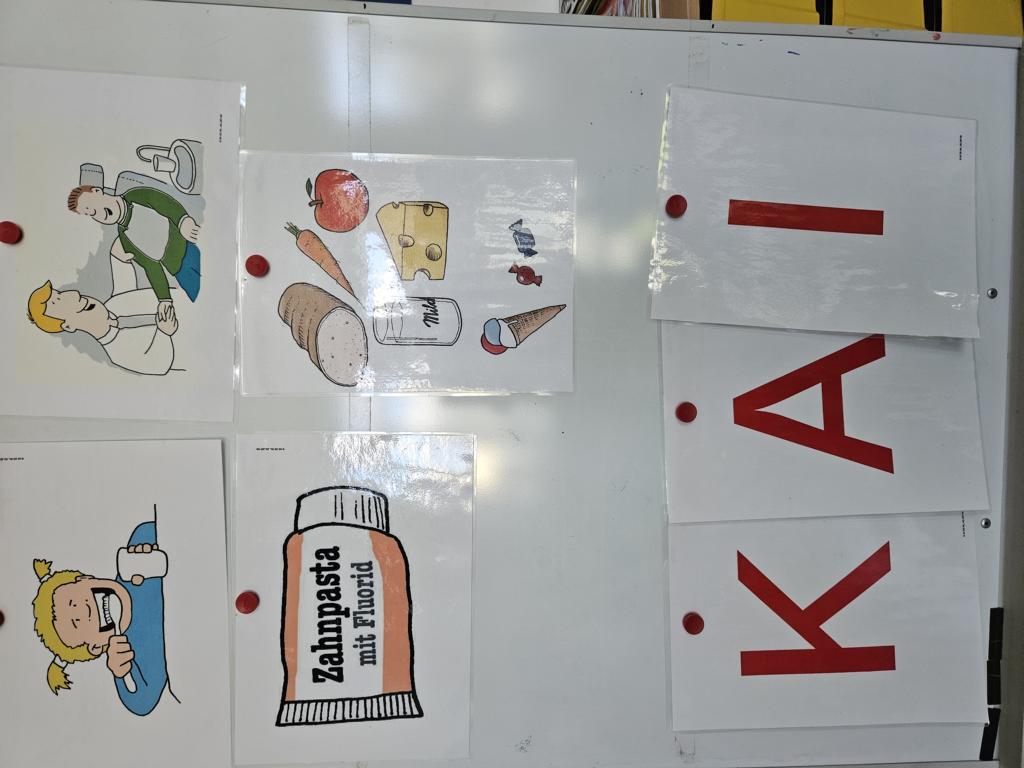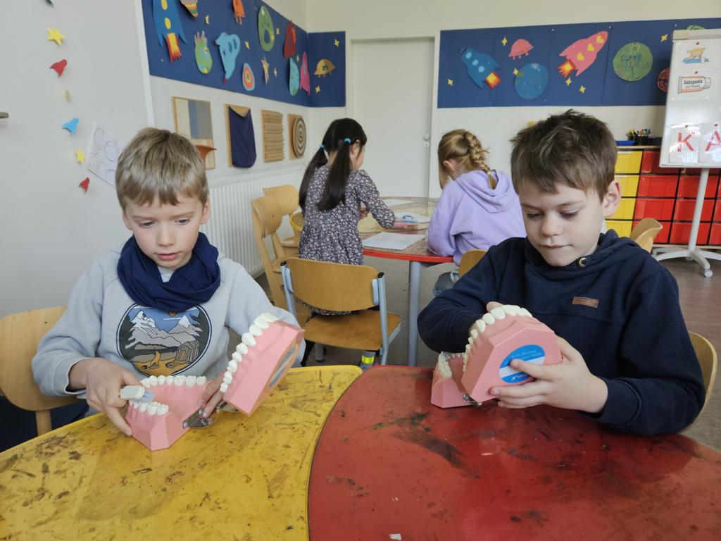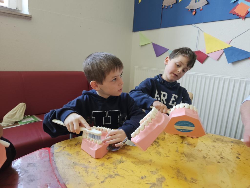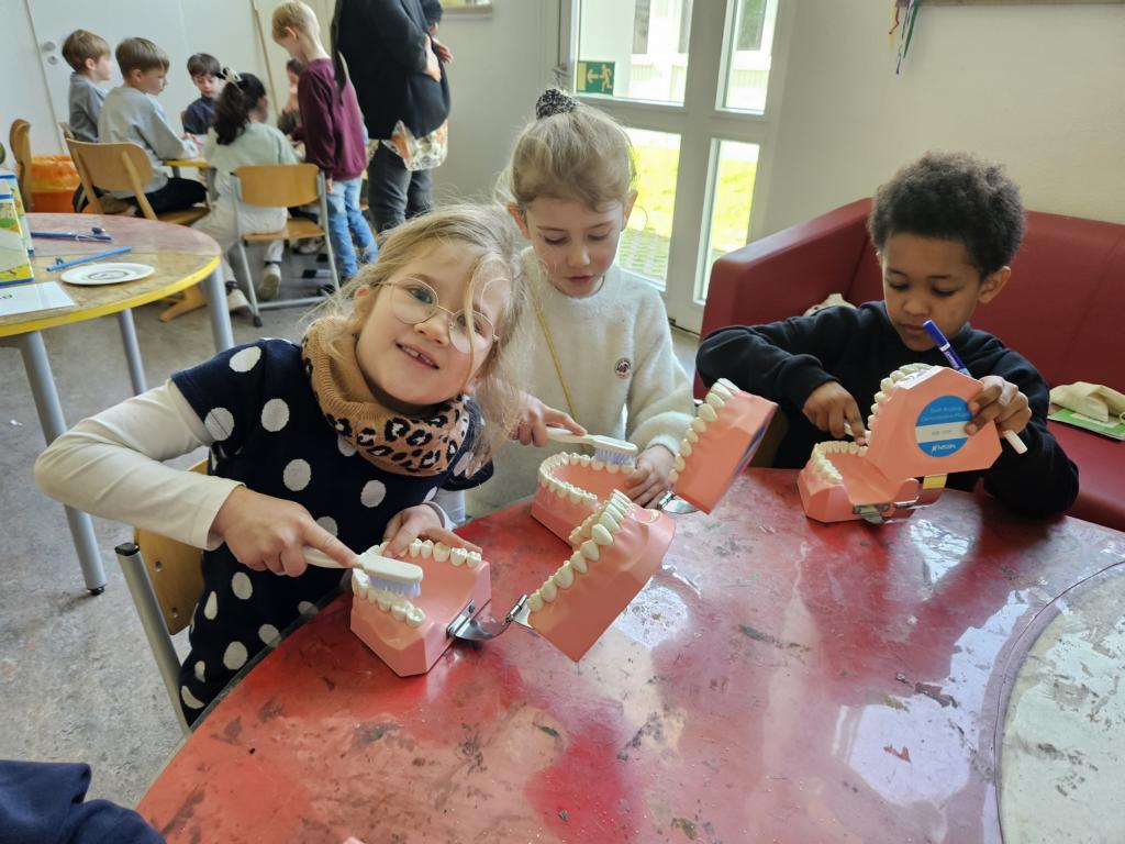 Anschließend gab es verschiedene Stationen, an denen wir weitere Dinge über unsere Nahrung, die Zähne und das Zähne putzen gelernt haben. Zum Abschluss konnte jedes Kind eine neue Zahnbürste auswählen und mitnehmen.