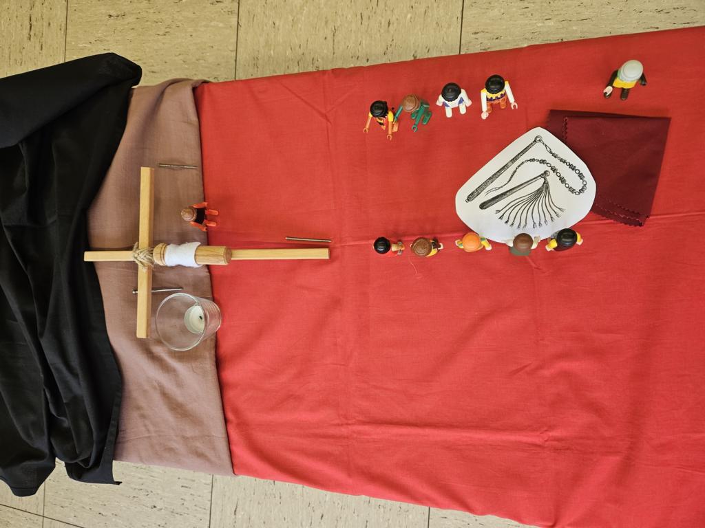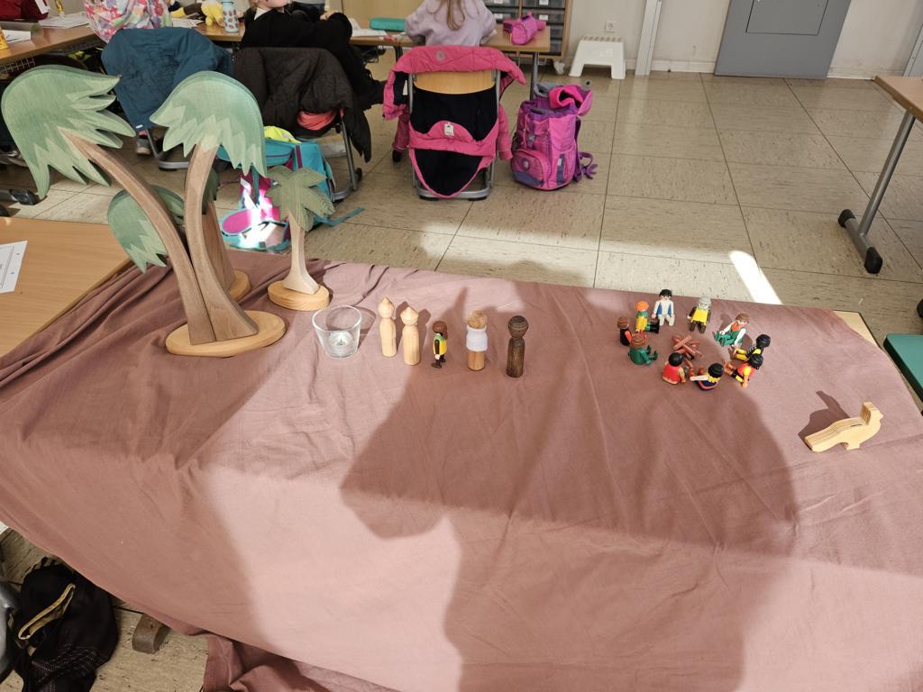 In der Zeit vor den Osterferien haben wir uns mit der Ostergeschichte befasst. Dazu haben wir die einzelnen Geschichten in einem Bodenbild gelegt und ein Osterbuch angelegt. Wir sind mit Palmsonntag gestartet und endeten bei Karfreitag. Die Ostergeschichte ist zunächst sehr traurig, aber viele kennen die ganze Ostergeschichte schon: Jesus ist auferstanden und bei Gott. Die Auferstehung und das Aufeinandertreffen der Jünger mit Jesus auf dem Weg nach Emmaus werden wir nach den Ferien erarbeiten.