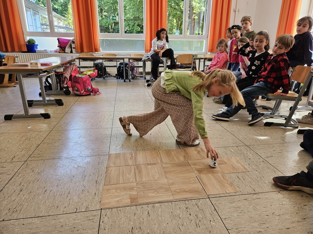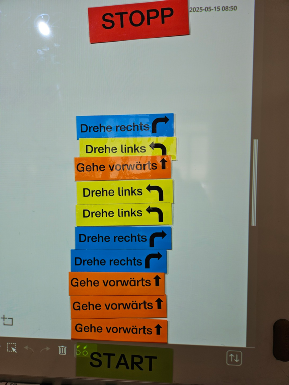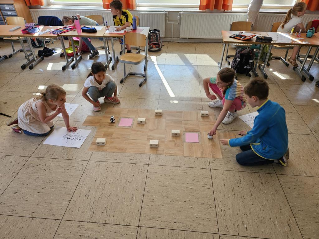 Im Sachunterricht lernen wir gerade, wie man einen Roboter programmieren kann. Es gibt Befehle für alle Richtungen. Wir überlegen, wie kommt man am schnellsten von einem Start zu einem Ziel. Wie lassen sich Programme kürzer fassen? Am Ende wird es einen kleinen Wettkampf geben: Wer schreibt das beste Programm und sammelt die meisten Schätze ein?