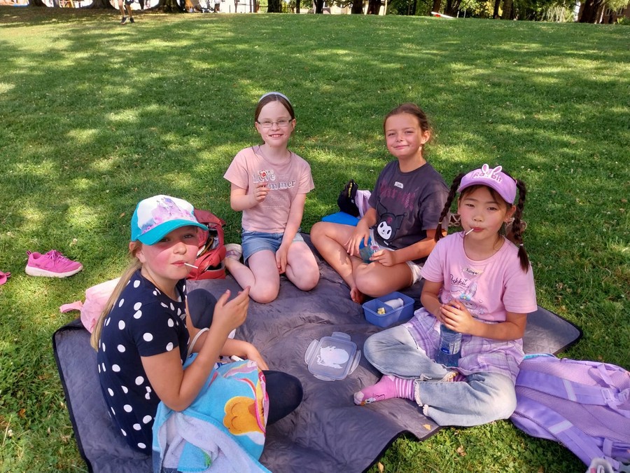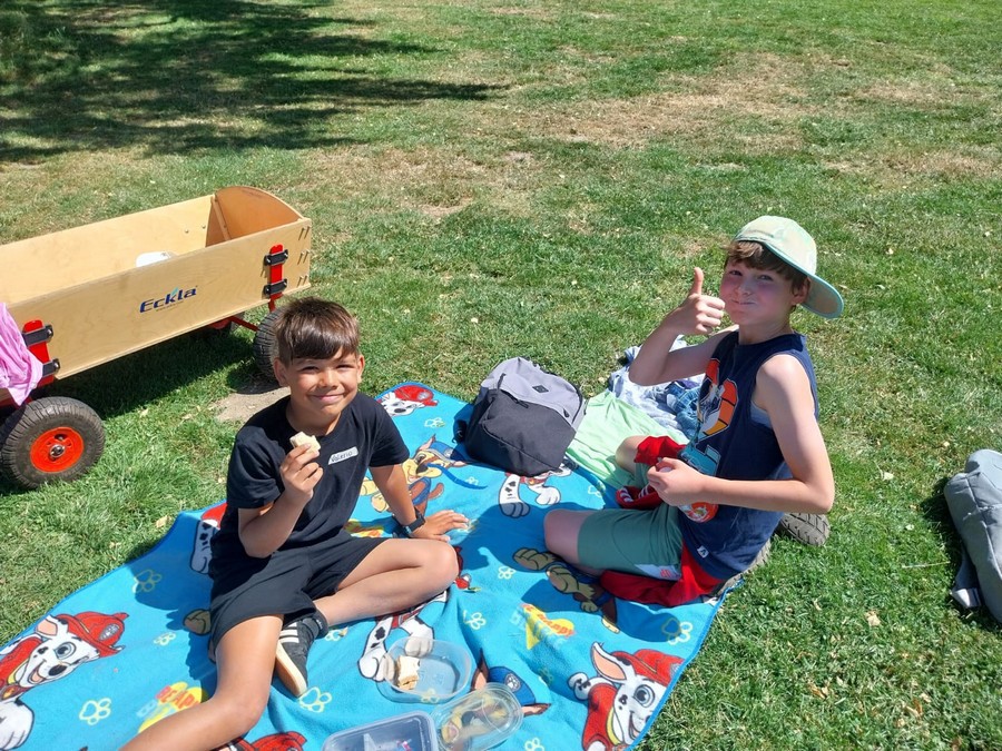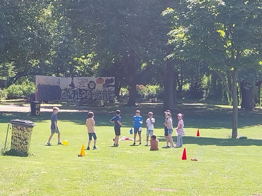 Unser Treffpunkt war dieses Mal auf den Paderwiesen. Wir hatten Picknickdecken ausgelegt und haben mit unseren Paten erstmal zusammen gefrühstückt. Dann haben wir ein Völkerballturnier veranstaltet.