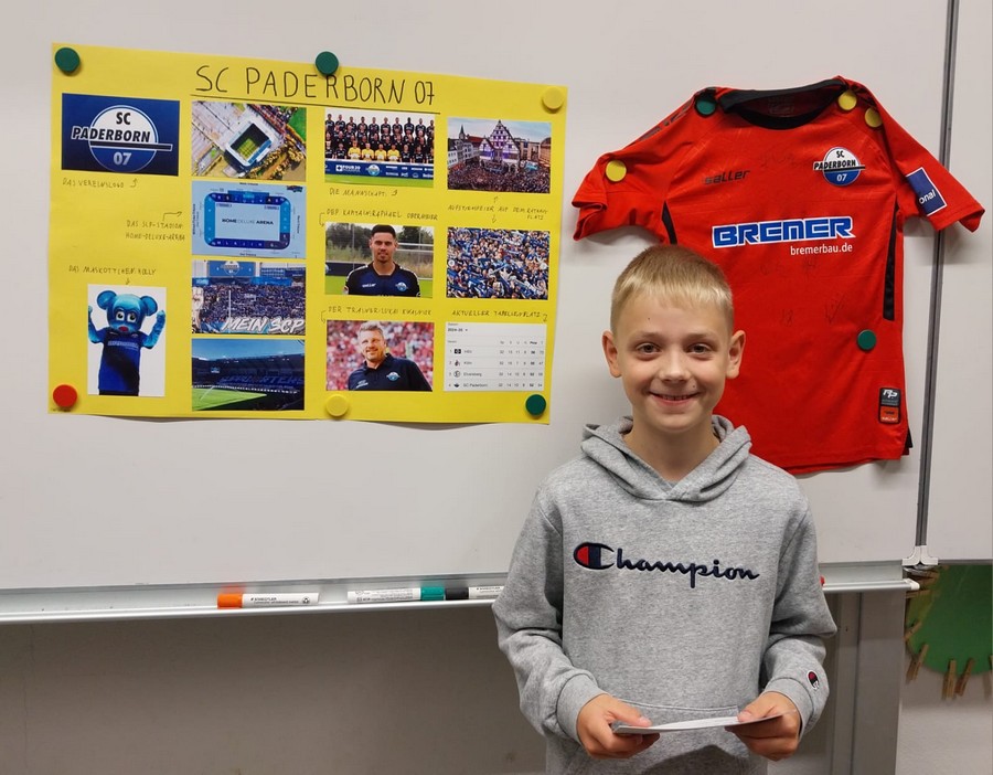 Anfang Oktober fand wieder unsere Sternwanderung statt. Dieses Jahr war aber neu, dass alle Klassen an der Schule gestartet und dann jahrgangsweise zu einem anderen Ziel gewandert sind. Unser Ziel war der Ahorn Sportpark. Auf dem Weg dorthin sind wir am Padersee vorbeigelaufen und dann Richtung des SCP-Stadions, wo wir vor einem großen Möbelgeschäft noch Fotos mit den Dinos machen konnten. Am Ahorn Sportpark angekommen haben wir erstmal alle gefrühstückt. Danach durften wir auf dem gesamten Gelände draußen spielen. Wir fanden die verschiedenen Sportparcoure toll und die Jungs haben auf den Kleinspielfeldern Fußball gespielt. Es gab so viele Möglichkeiten zum Spielen, dass die Zeit sehr schnell verflogen ist. Zum Schluss sind wir dann den Weg zur Schule wieder zu Fuß zurückgelaufen und hatten insgesamt einen ganz besonderen Tag.