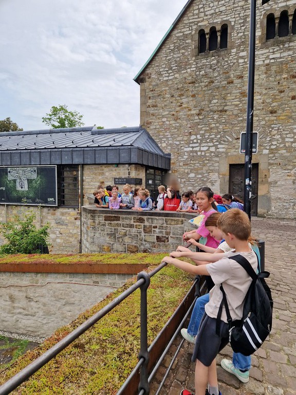 Am 18.09.24 fuhren wir mit allen Kindern des vierten Jahrgangs auf Klassenfahrt an den Möhnesee. Unsere Frühstückspause verbrachten wir an der Möhnetalsperre. Wir liefen einmal über die Sperrmauer an das gegenüberliegende Ufer und zurück. Dabei staunten wir über Westfalens schwerstes Baudenkmal und genossen die tolle Aussicht auf den See.