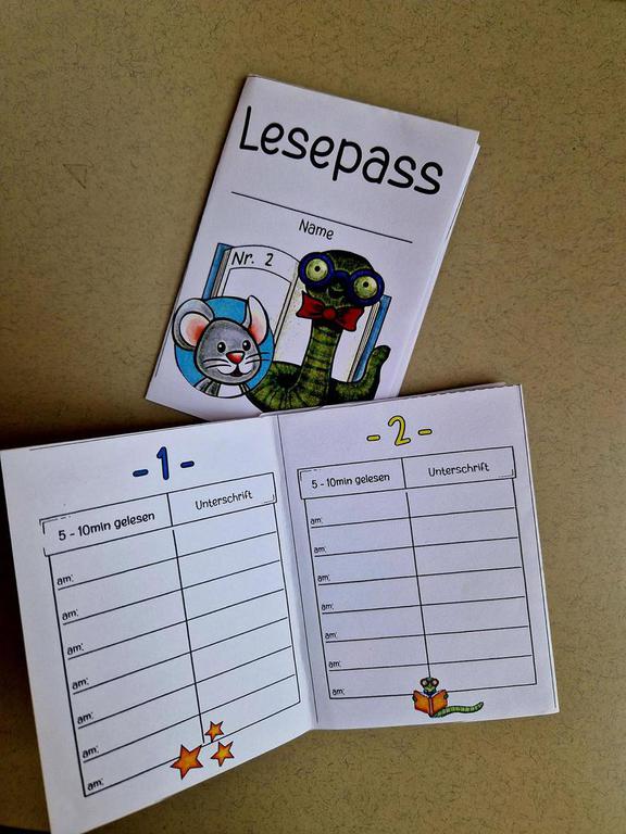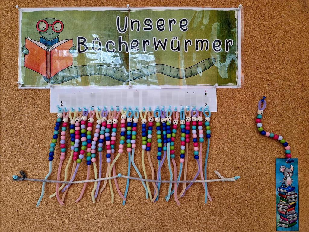 In der Klasse 1a sammeln die Kinder fleißig Perlen für ihre Bücherwürmer. Für eine Perle muss man siebenmal zuhause gelesen haben. Die Unterschriften dafür werden in einem Lesepass von den Eltern festgehalten. Wenn die Kinder vierzehn Perlen gesammelt haben, bekommen sie ein Lesezeichen für ihren fertigen Bücherwurm.