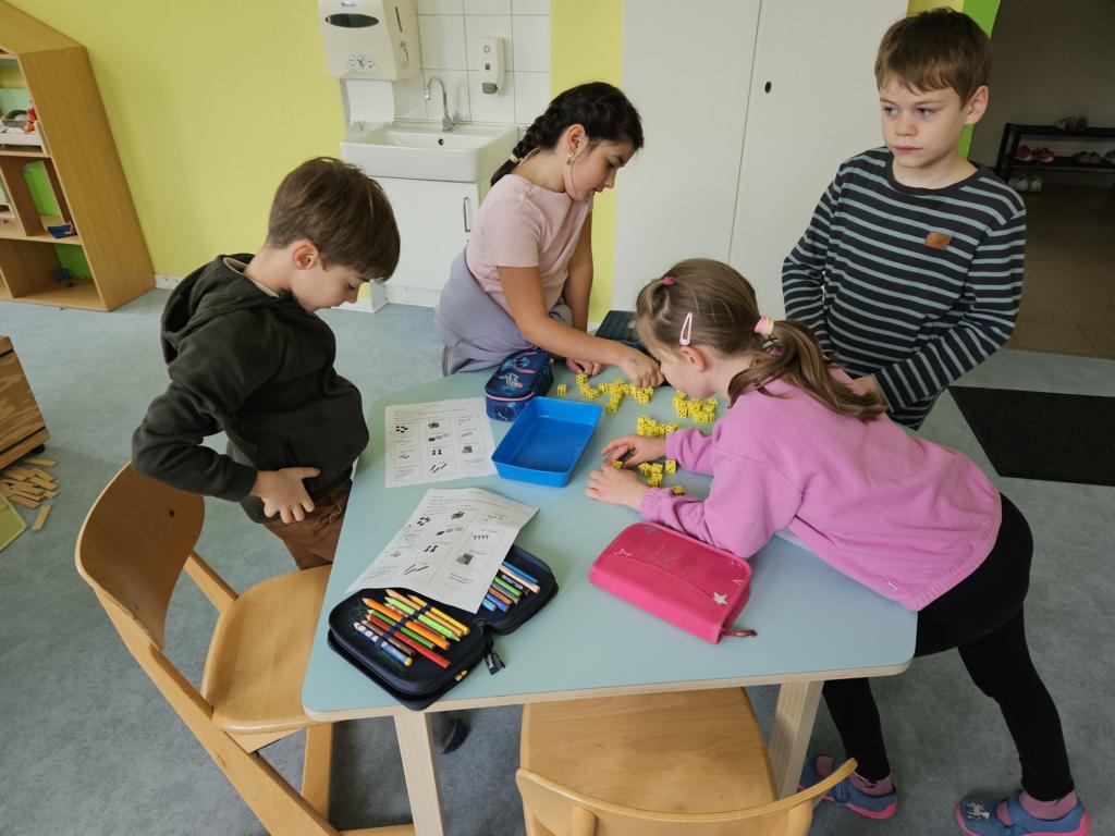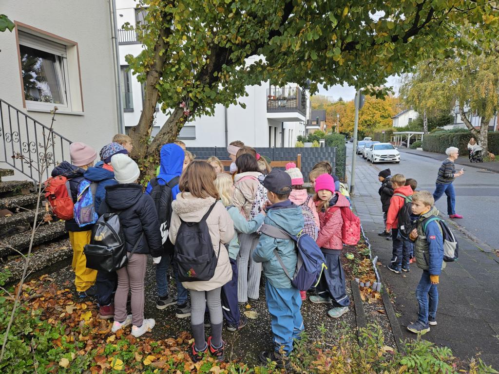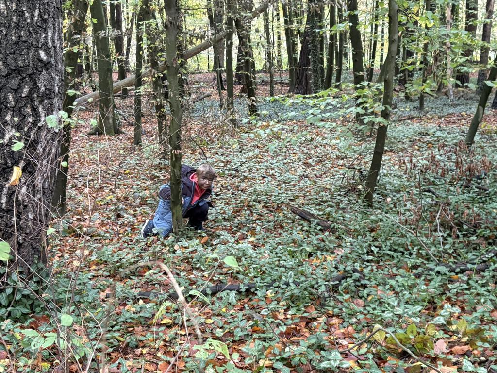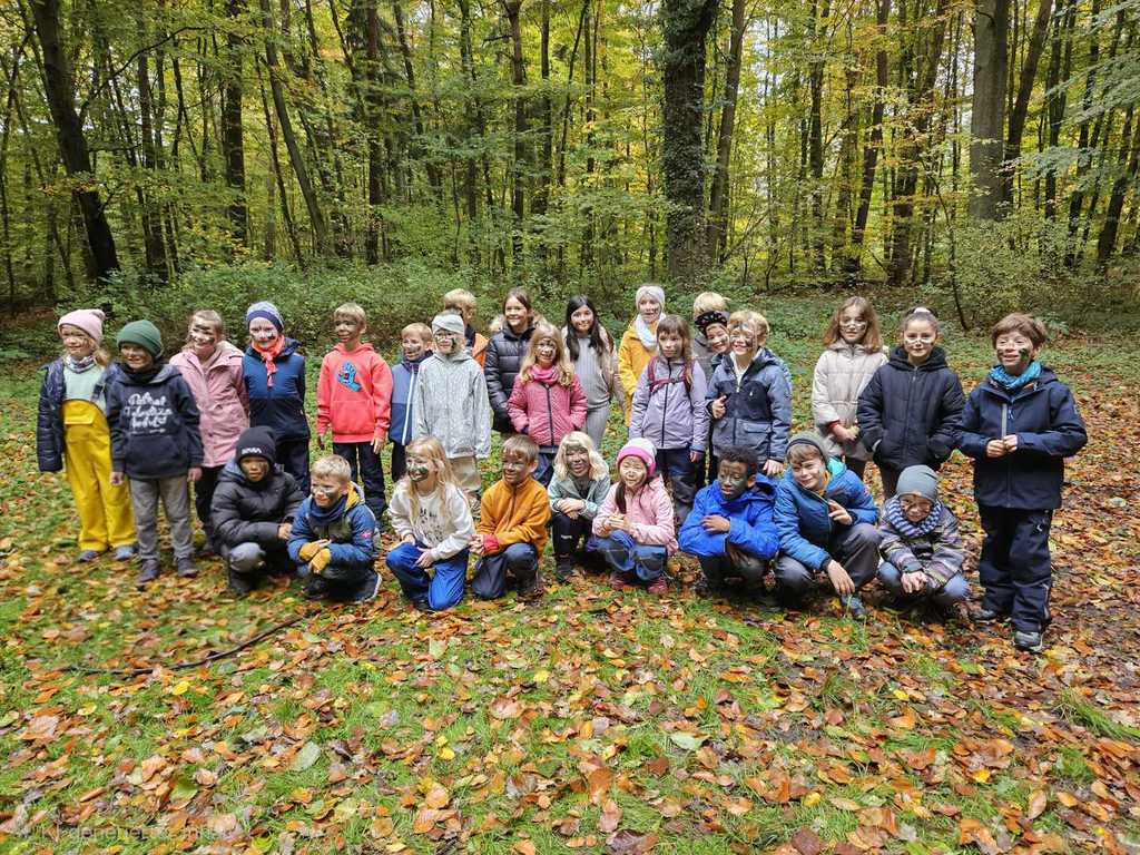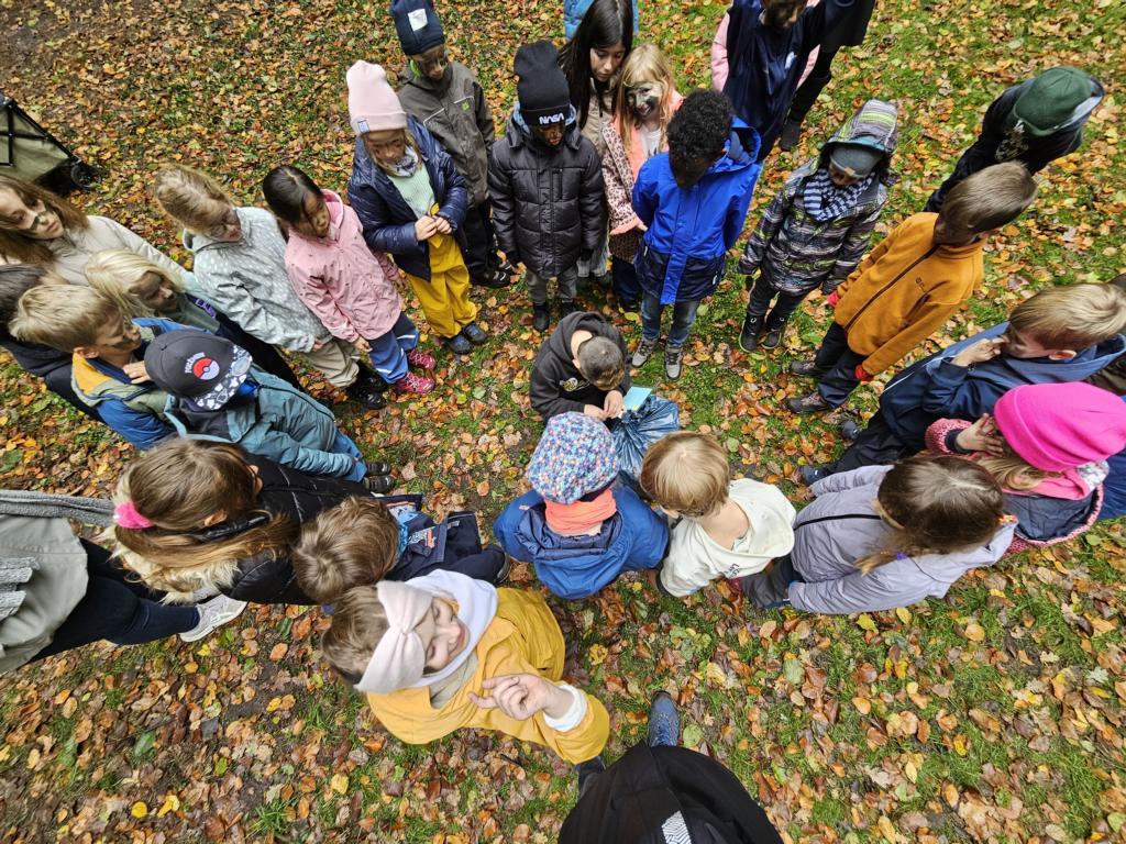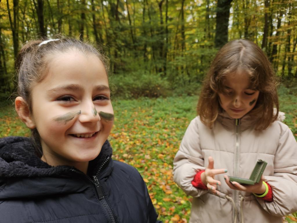 Auf unseren Weg zum Treffpunkt mussten wir erste Rätsel lösen. Wir mussten Rechenaufgaben ausrechnen und die Hausnummern einiger Kinder waren auch notwendig. Ein Drachenei konnten wir dabei retten. Bei der Vorstellungsrunde am Treffpunkt hat jeder etwas Positives über seinen Nachbarn gesagt. Das war ein schönes Gefühl für viele Kinder. Anschließend haben wir uns in Partnerarbeit getarnt, damit wir unerkannt im Wald nach weiteren Eiern suchen können.