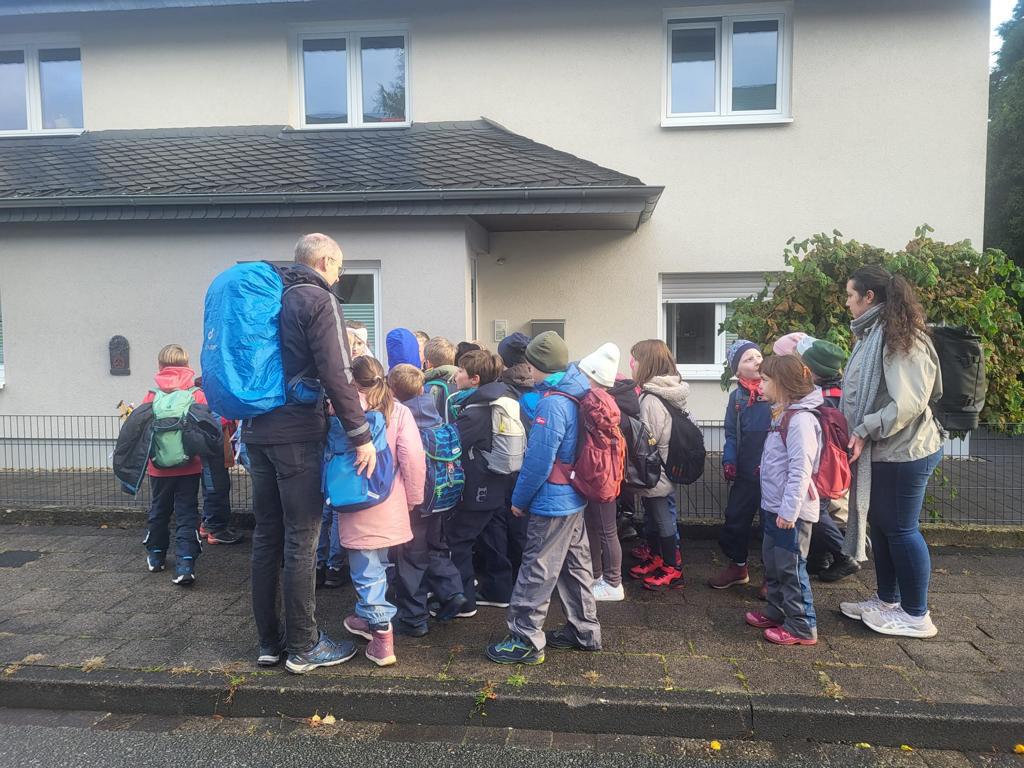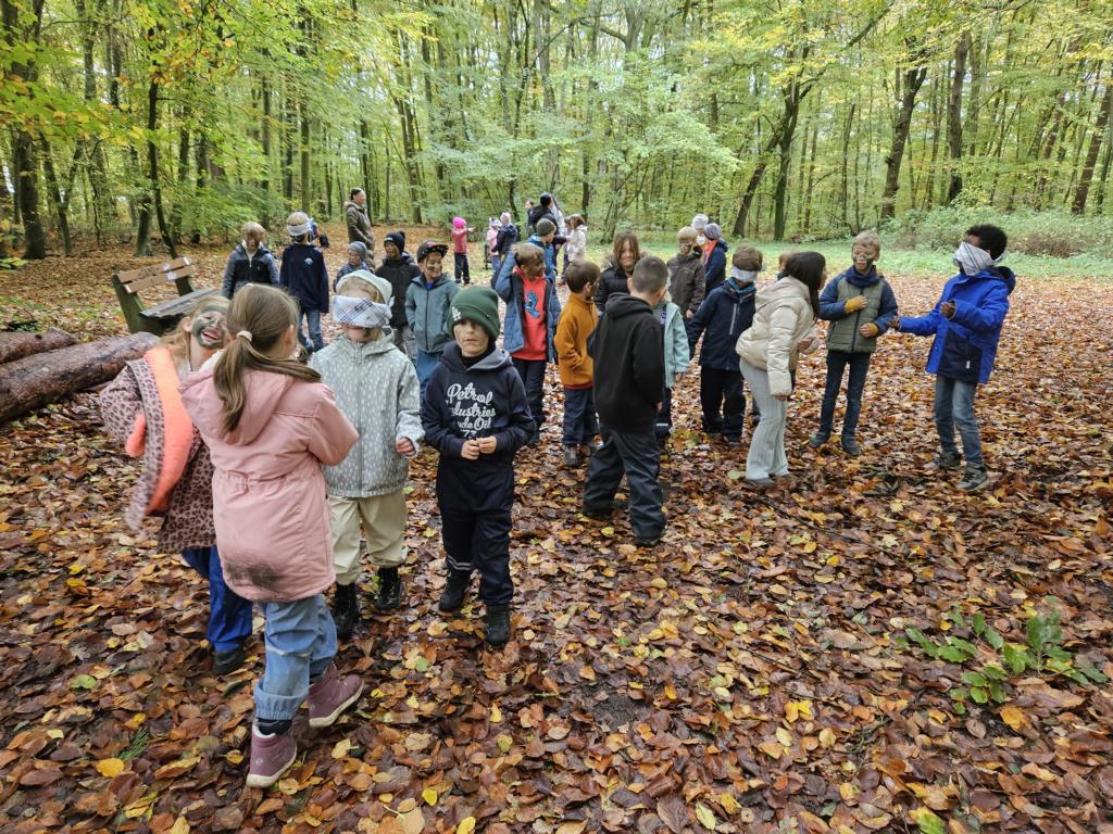 Heute waren wir im Grünen Klassenzimmer in Schloß Neuhaus. Zuerst sind wir von der Schule zum Startpunkt gewandert. Das ging ziemlich schnell, weil wir gute Wanderer sind.