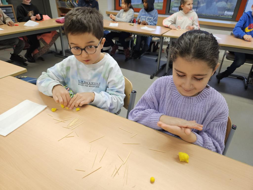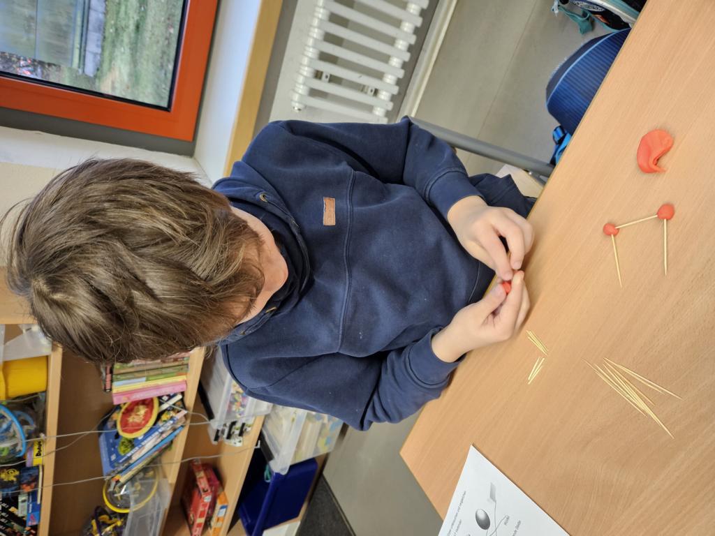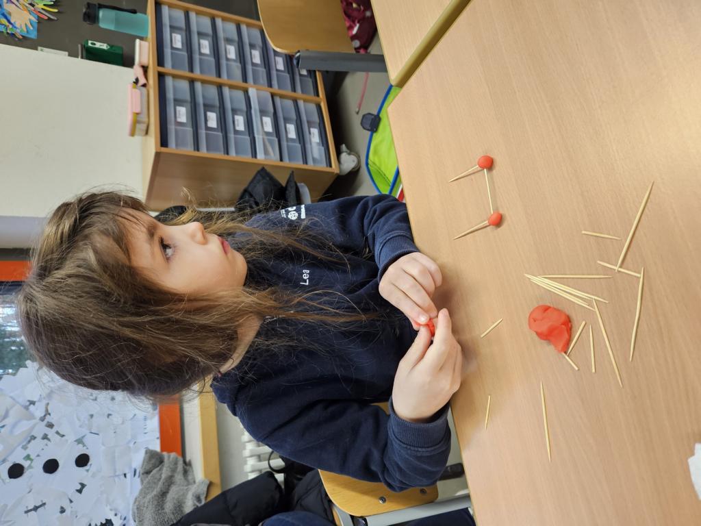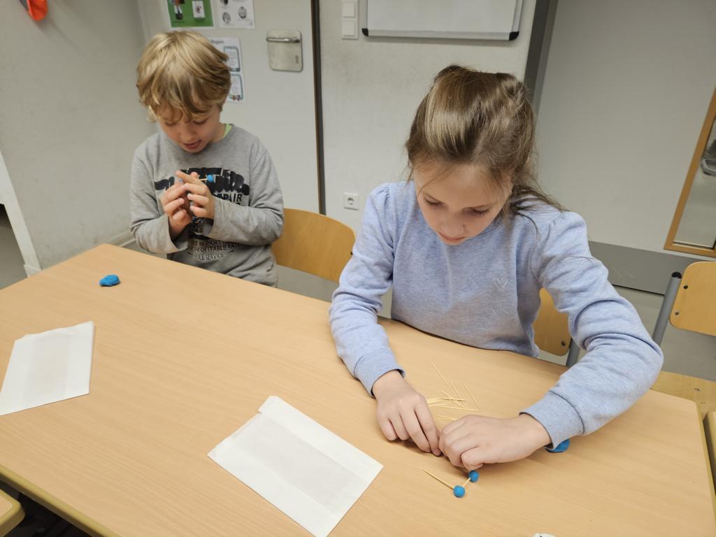 Wir haben die Körper in unserer Umwelt gesucht und viele Beispiel gefunden. Auch das Untersuchen der Körper auf ihre Flächen, Ecken und Kanten war für viele Kinder etwas Neues. Außerdem bauten wir Kantenmodelle aus Knete und Zahnstochern. Das haben wir prima hinbekommen und unser Wissen über den Quader und den Würfel vertieft.