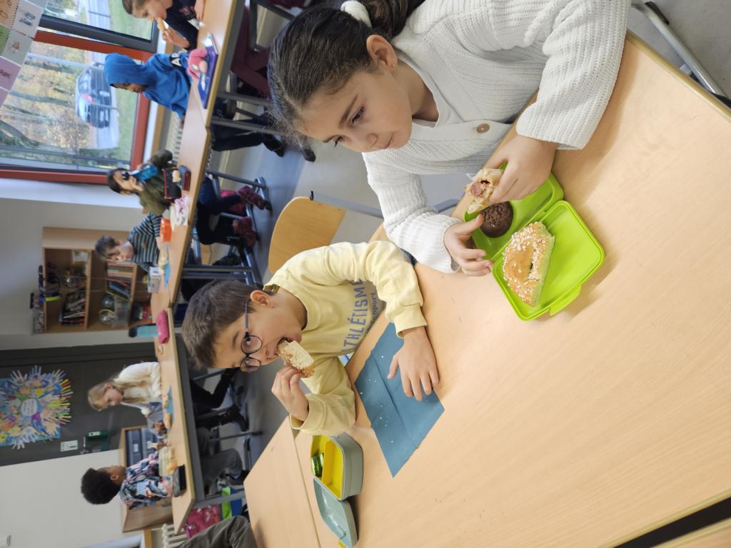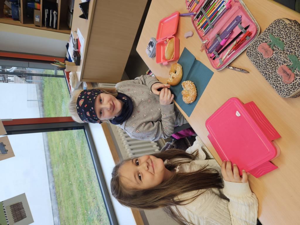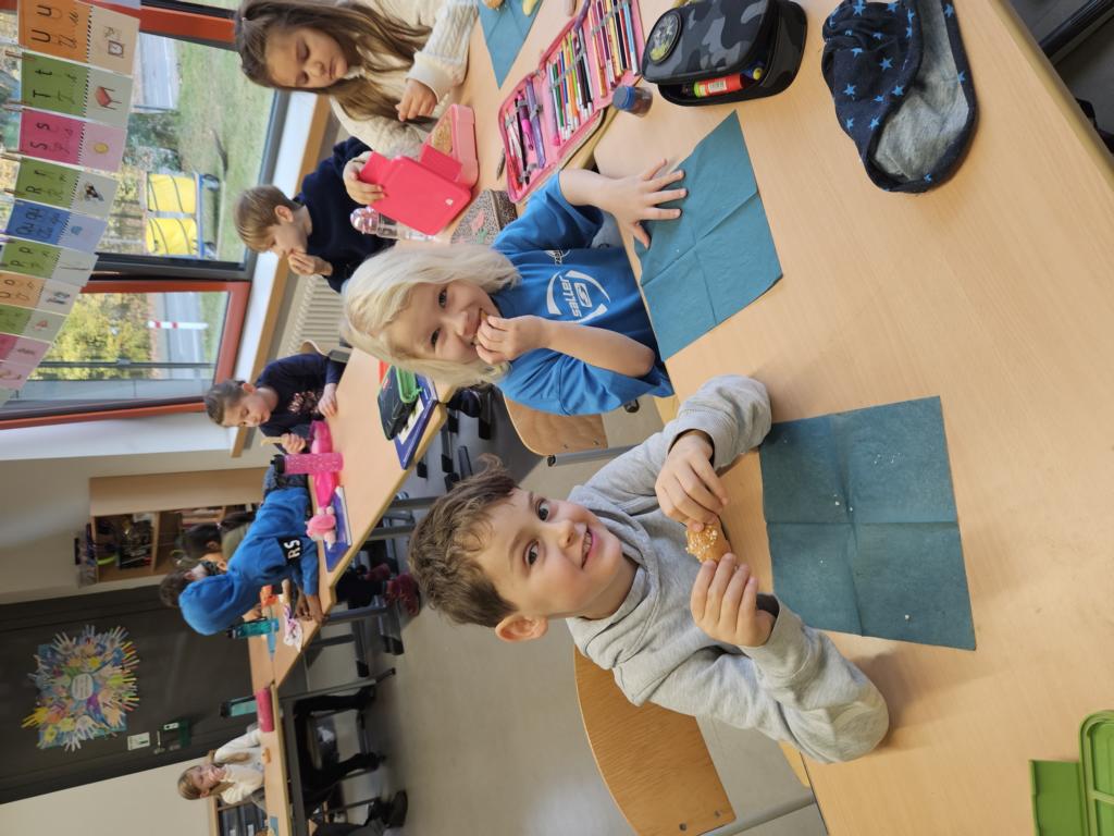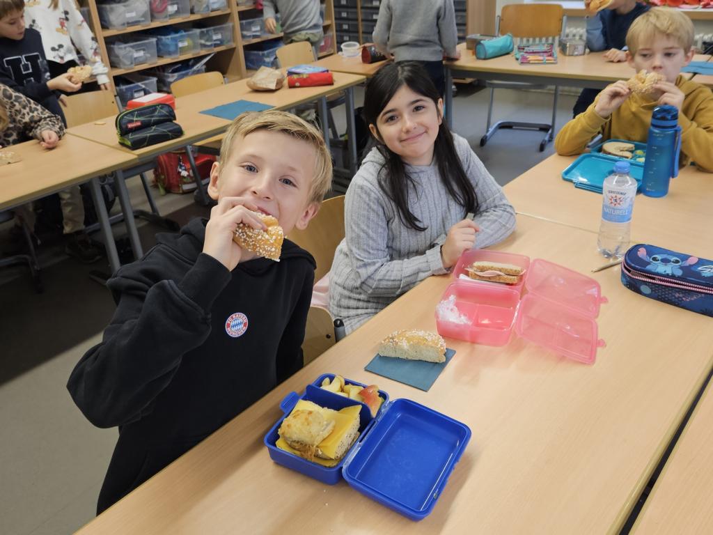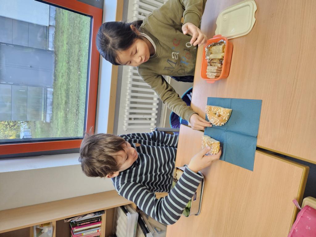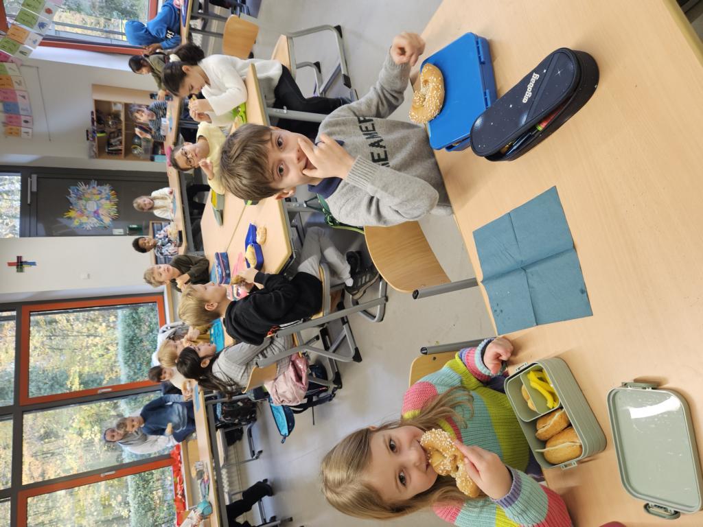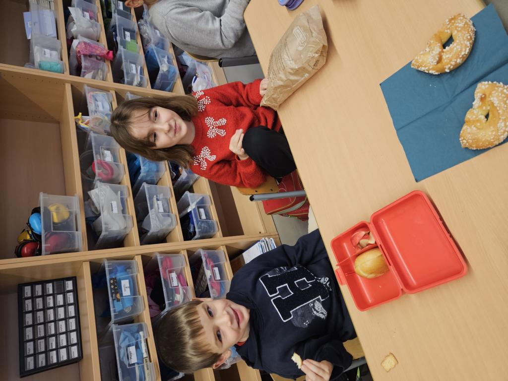 In dieser Woche feiern wir das Martinsfest. Am 14.11. sind wir dazu in die Kirche gegangen. Die Kinder aus den Klassen 3 haben den Gottesdienst vorbereitet. Nachdem wir wieder in der Klasse waren, bekamen immer zwei Kinder eine Martinsbrezel. Diese wurde gerecht geteilt.