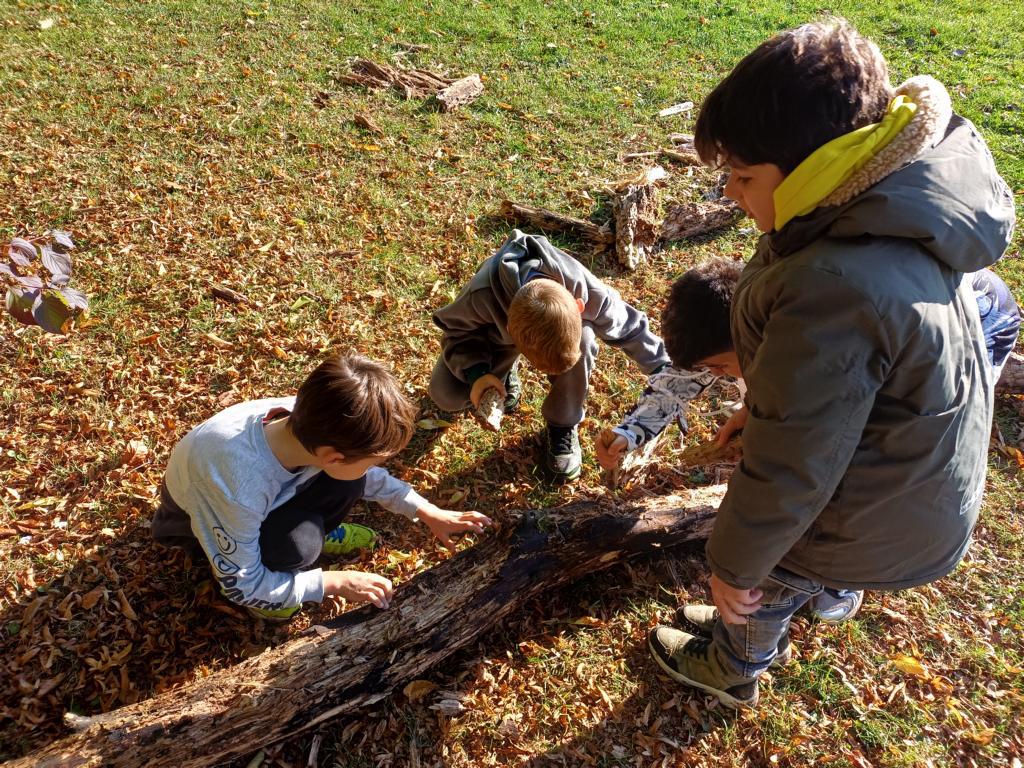 Nachdem wir nun unsere Augen für die Suche nach Tieren im Totholz vorbereitet hatten, ging es endlich los. Zu Zweit mit einem Behälter und einer Schaufel suchten wir kleine Tiere. Alle Kinder waren sehr interessiert und suchten mit viel Spaß nach Insekten, Schnecken, Spinnen oder Käfern.