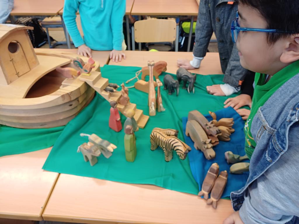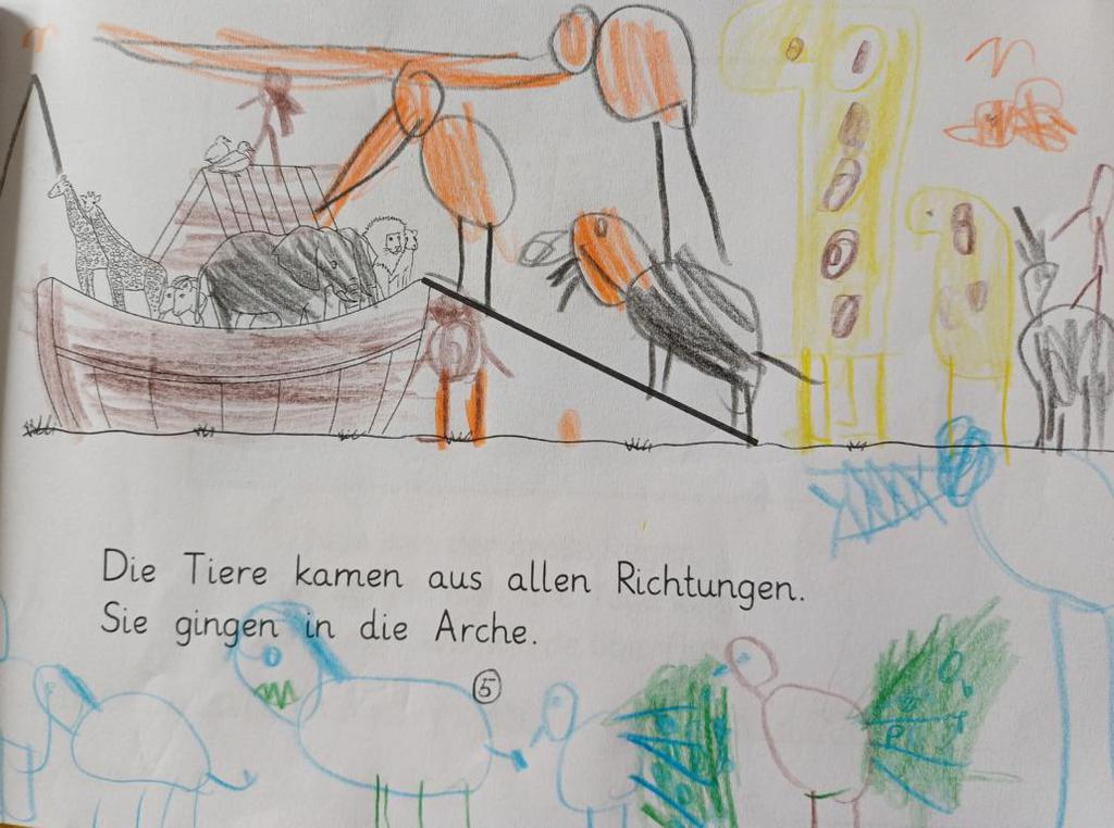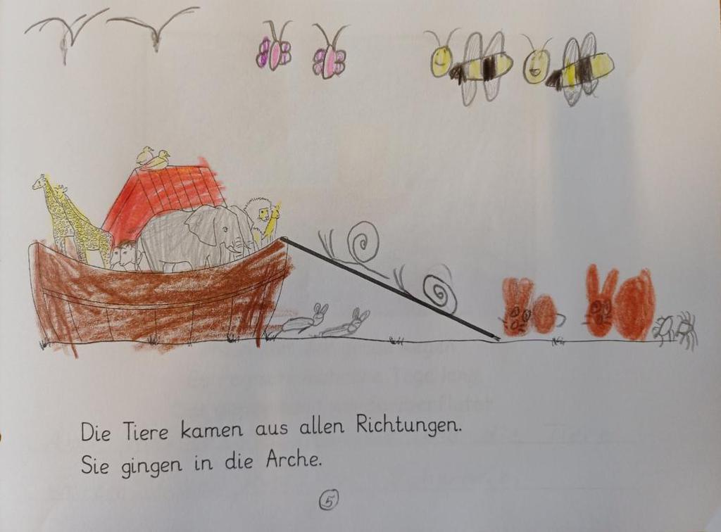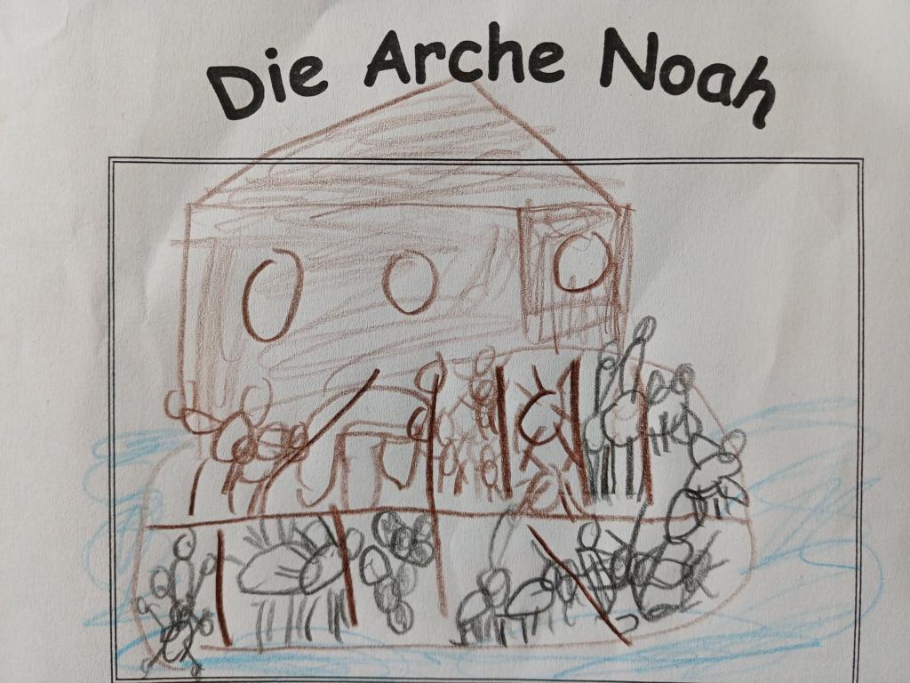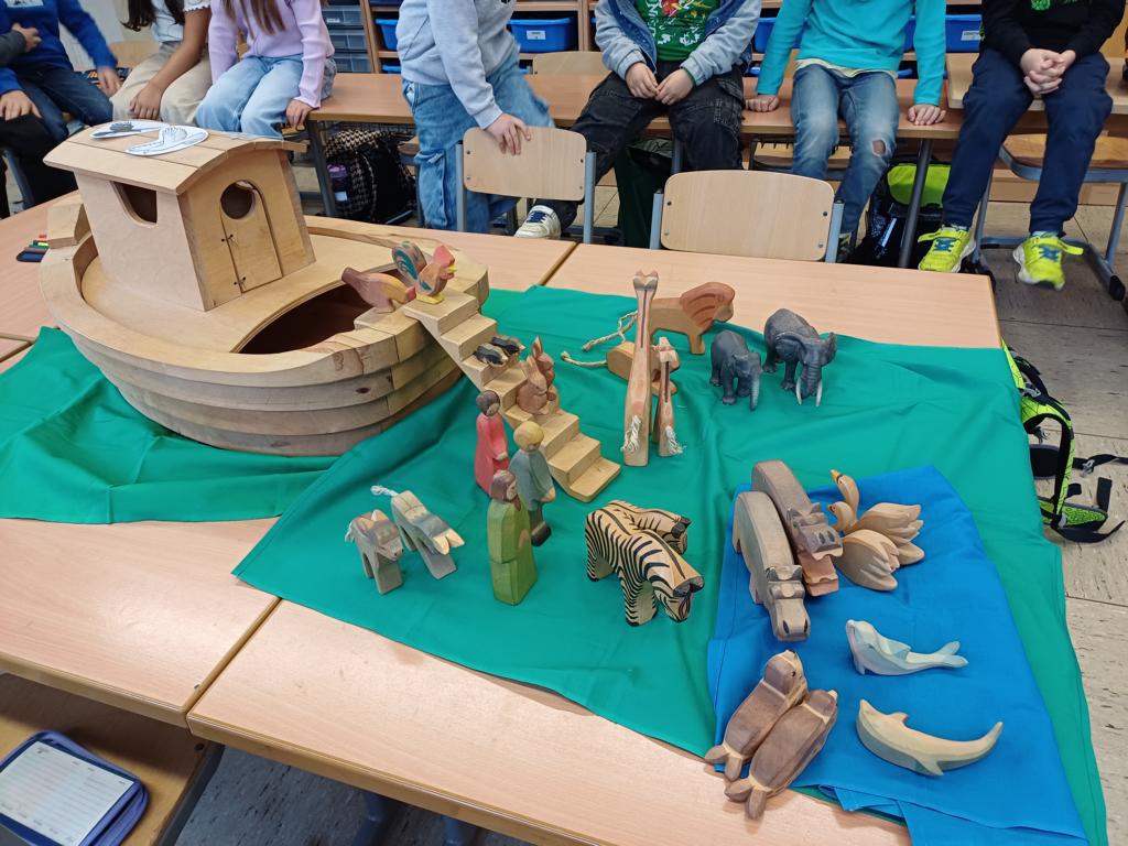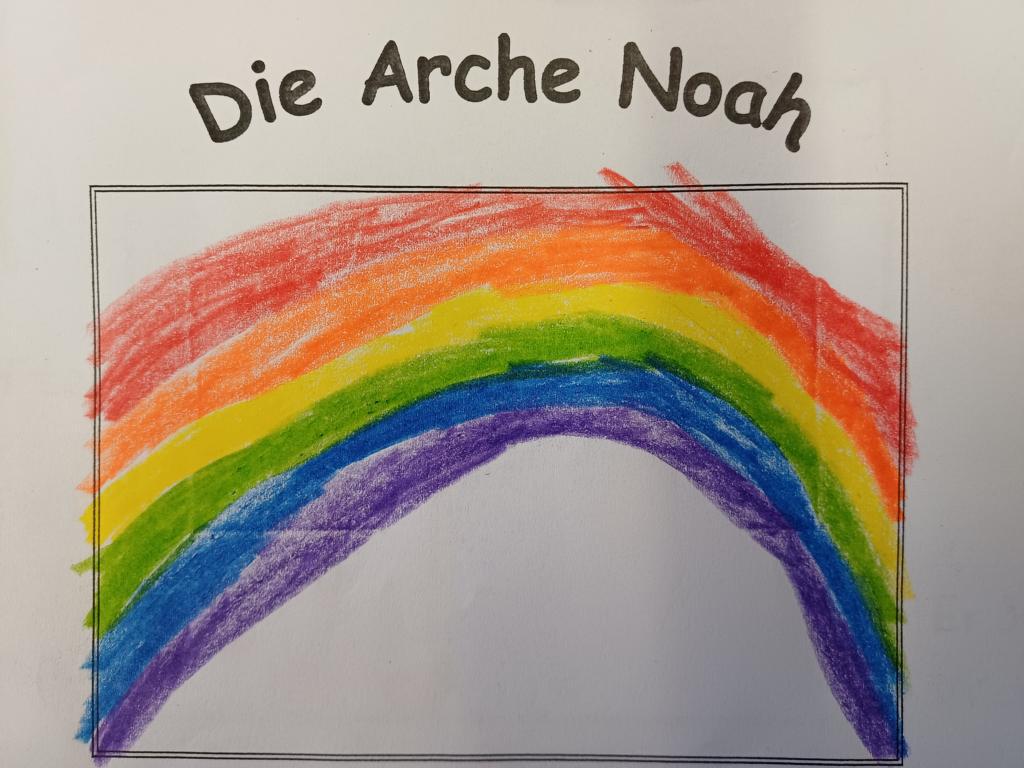 In der 2c ging es im Religionsunterricht um Noah und seine Arche. Wir haben die Geschichte aus der Bibel gehört, mit einer großen Holzarche und Figuren nachgespielt und dazu ein kleines Büchlein erstellt. Besonders schön leuchten die Regenbögen, die Gottes Verbindung zu den Menschen darstellen. Zum Abschluss der Reihe haben wir die Geschichte noch einmal „auf unserem Rücken“ erlebt, als ein Partner dazu ganz vorsichtig Bewegungen mit den Fingern gemacht hat.