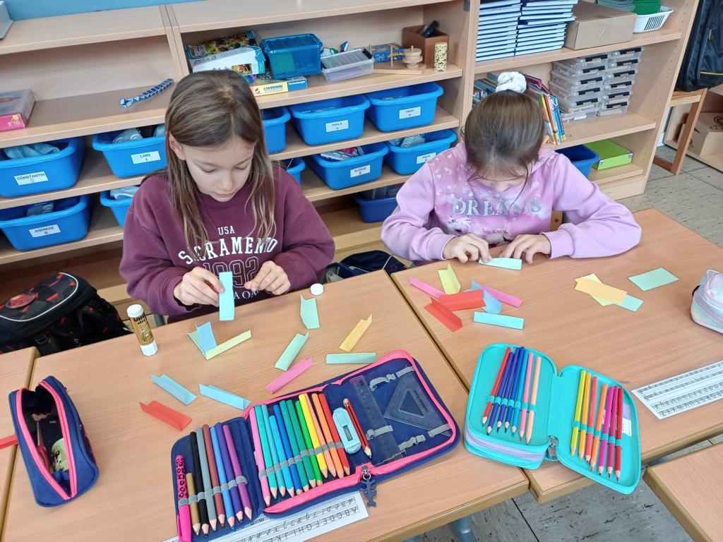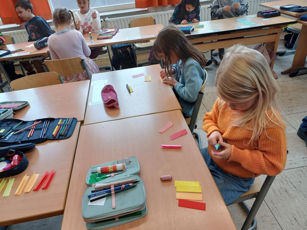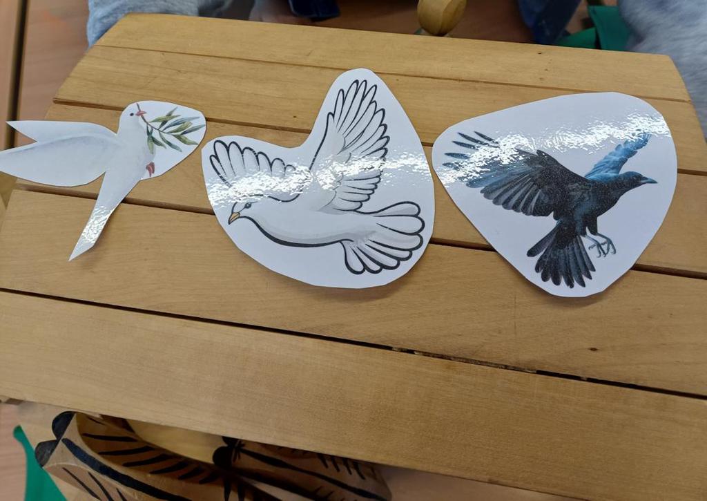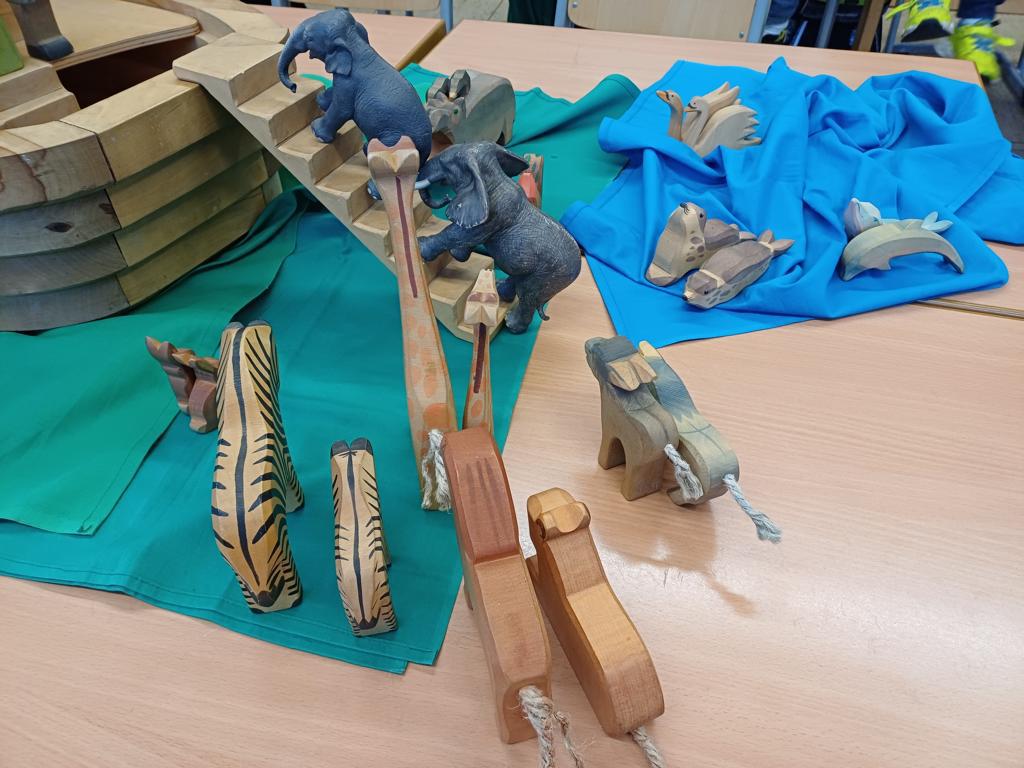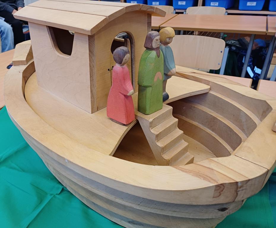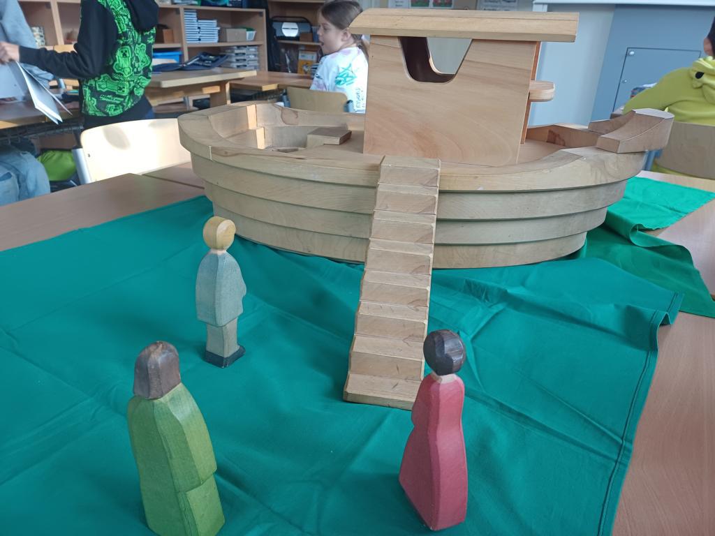 In der 2c ging es im Religionsunterricht um Noah und seine Arche. Wir haben die Geschichte aus der Bibel gehört, mit einer großen Holzarche und Figuren nachgespielt und dazu ein kleines Büchlein erstellt. Besonders schön leuchten die Regenbögen, die Gottes Verbindung zu den Menschen darstellen. Zum Abschluss der Reihe haben wir die Geschichte noch einmal „auf unserem Rücken“ erlebt, als ein Partner dazu ganz vorsichtig Bewegungen mit den Fingern gemacht hat.