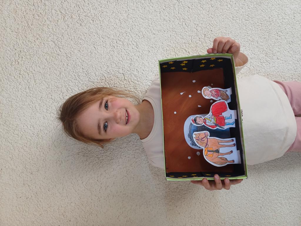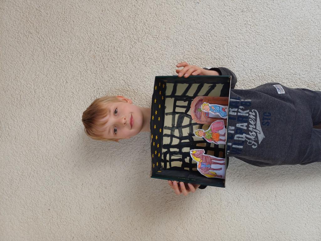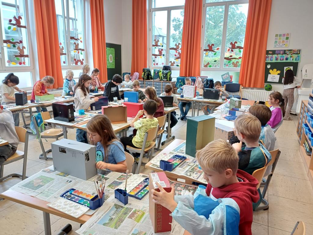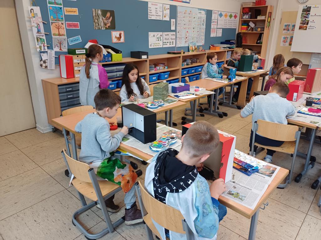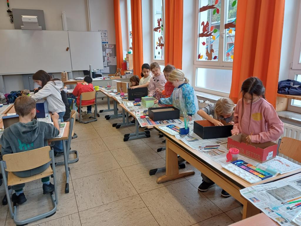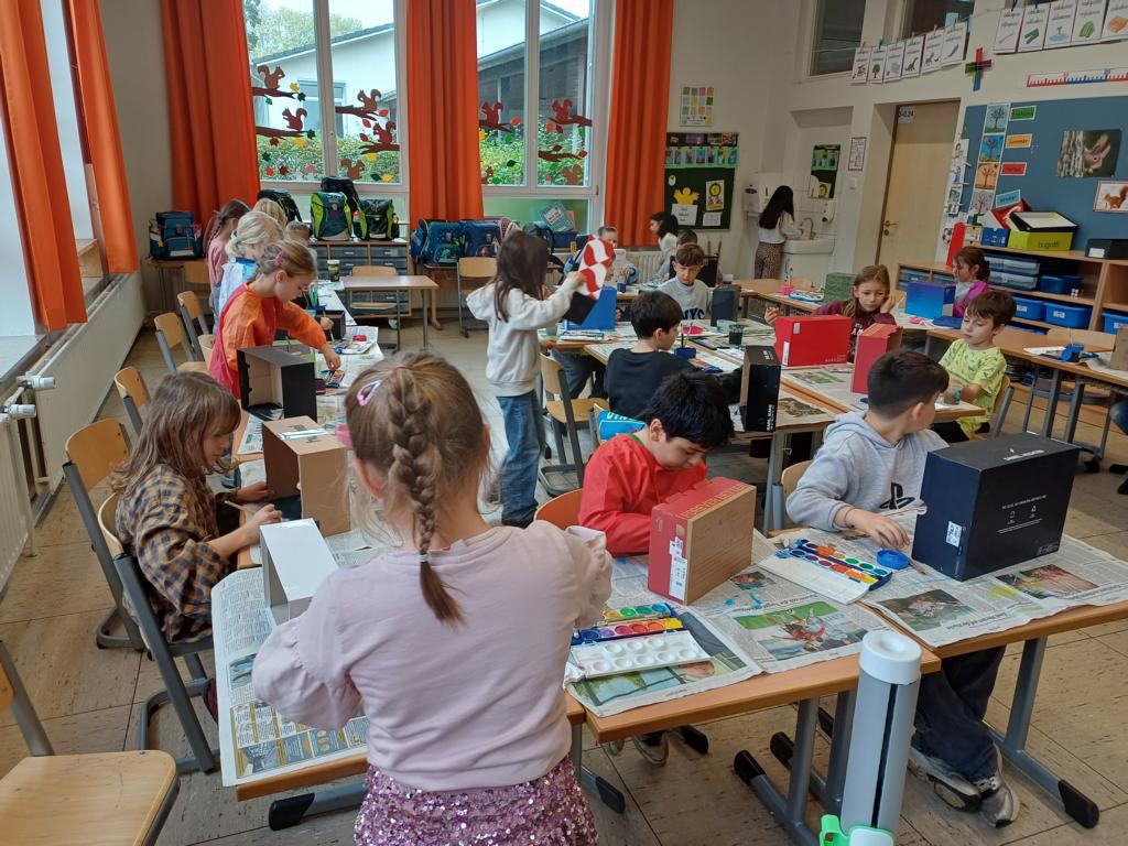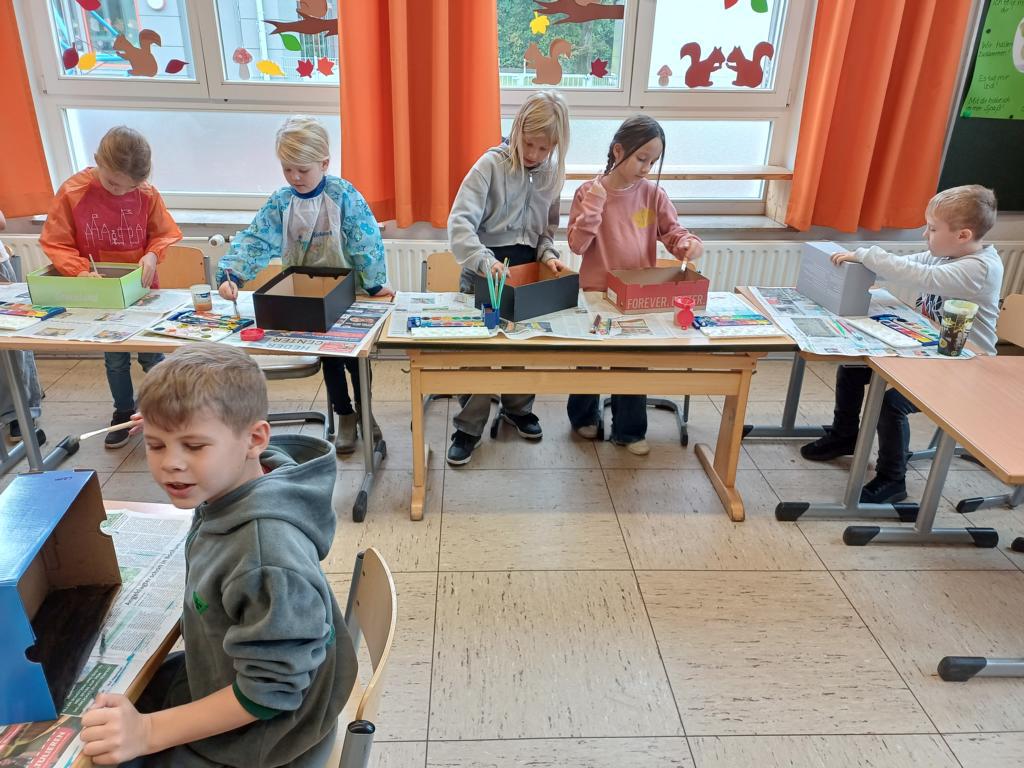 Passend zum Sankt-Martins-Fest haben die Kinder der 2c im Kunstunterricht Schuhkartons gestaltet. Der Bettler sitzt vor einer Stadtmauer und Sankt Martin teilt seinen Mantel. Liebevoll und ideenreich