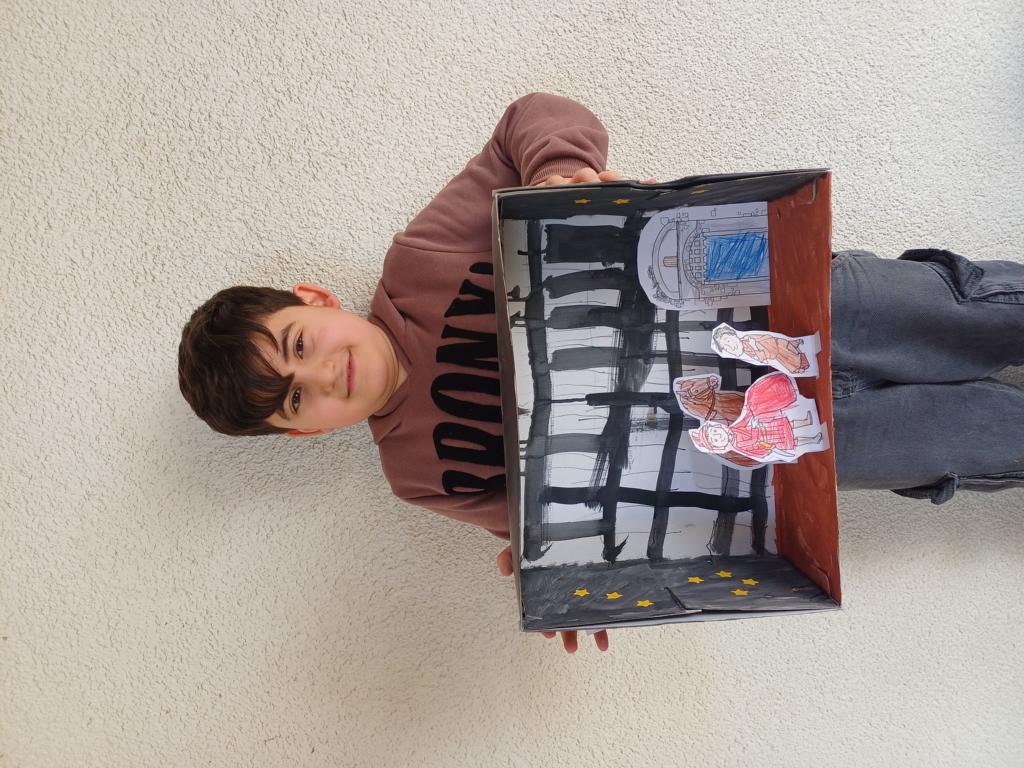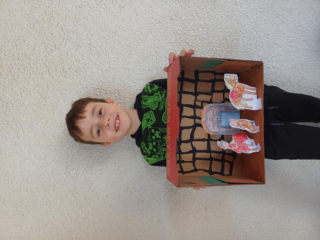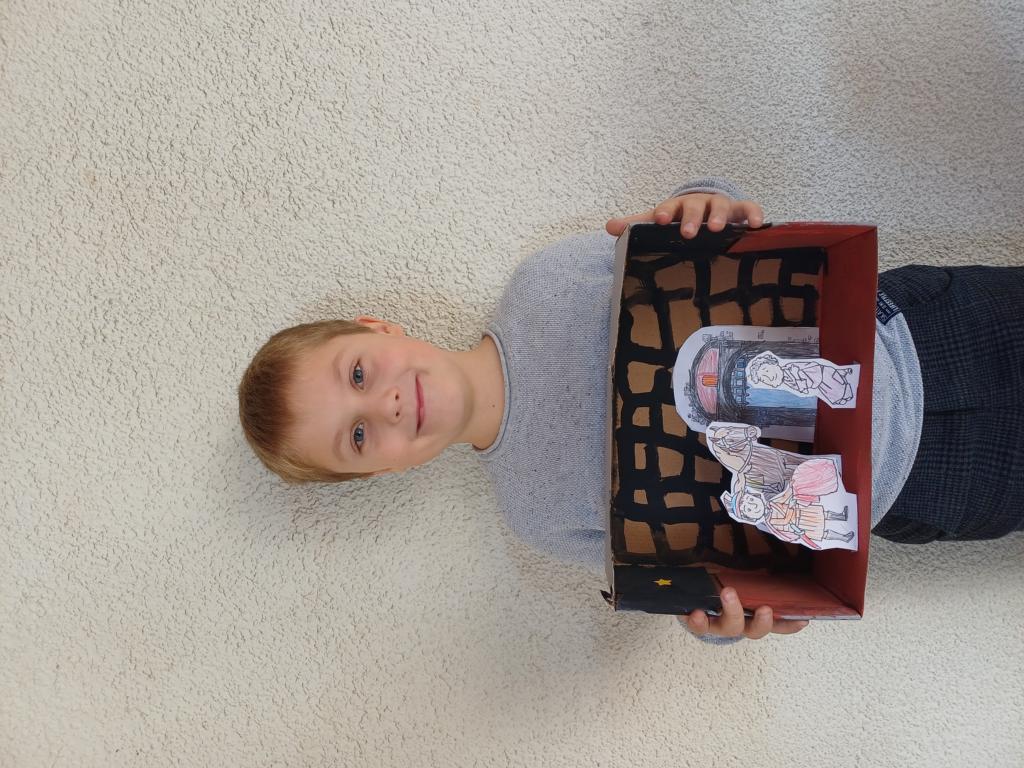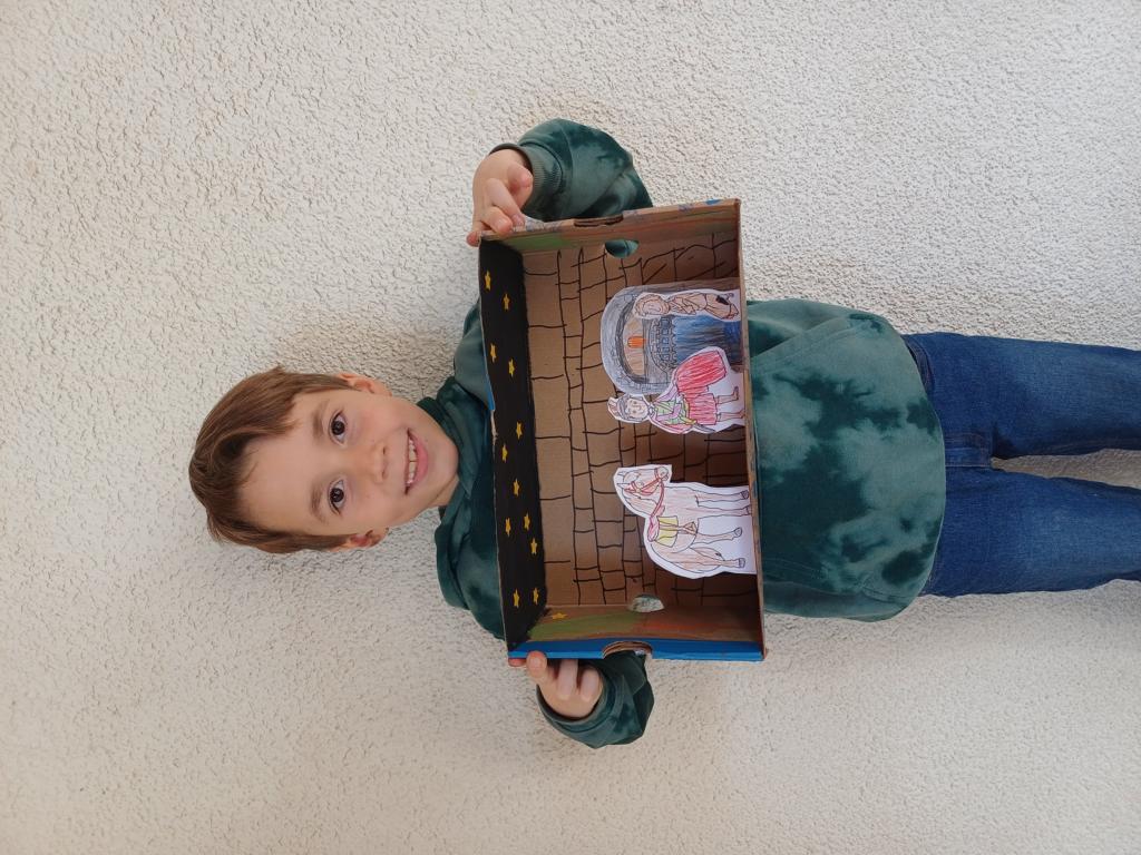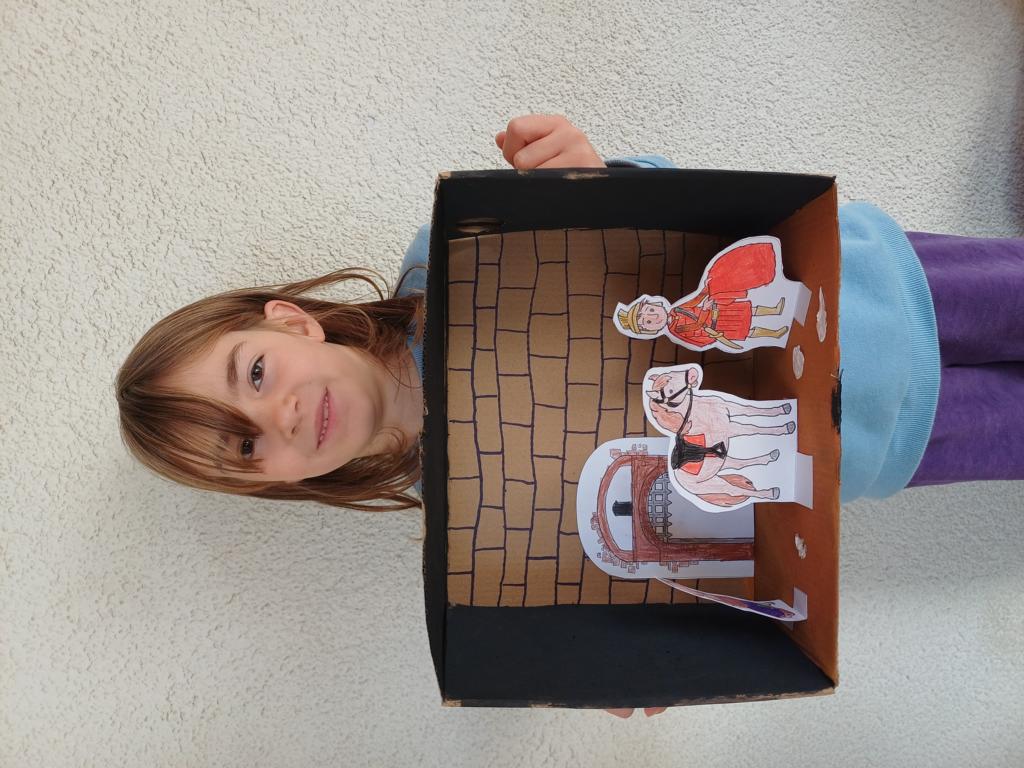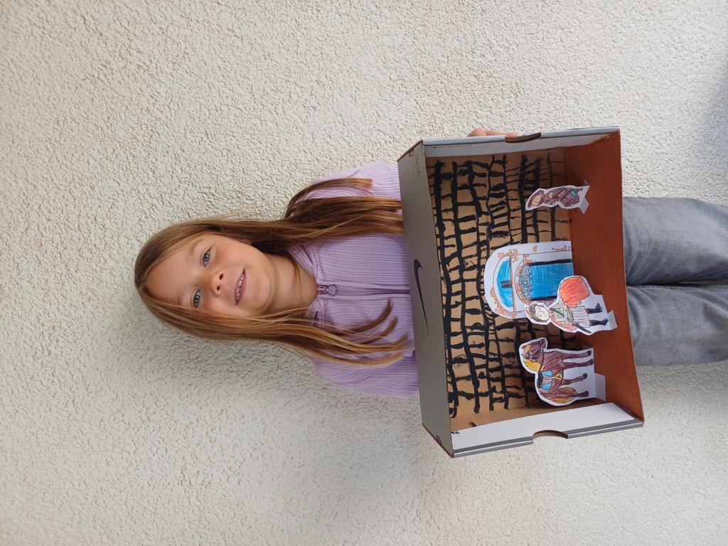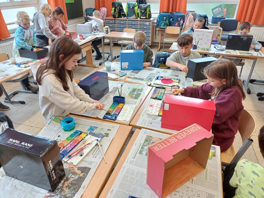 Passend zum Sankt-Martins-Fest haben die Kinder der 2c im Kunstunterricht Schuhkartons gestaltet. Der Bettler sitzt vor einer Stadtmauer und Sankt Martin teilt seinen Mantel. Liebevoll und ideenreich