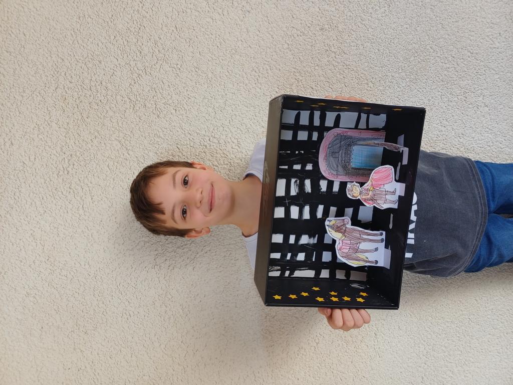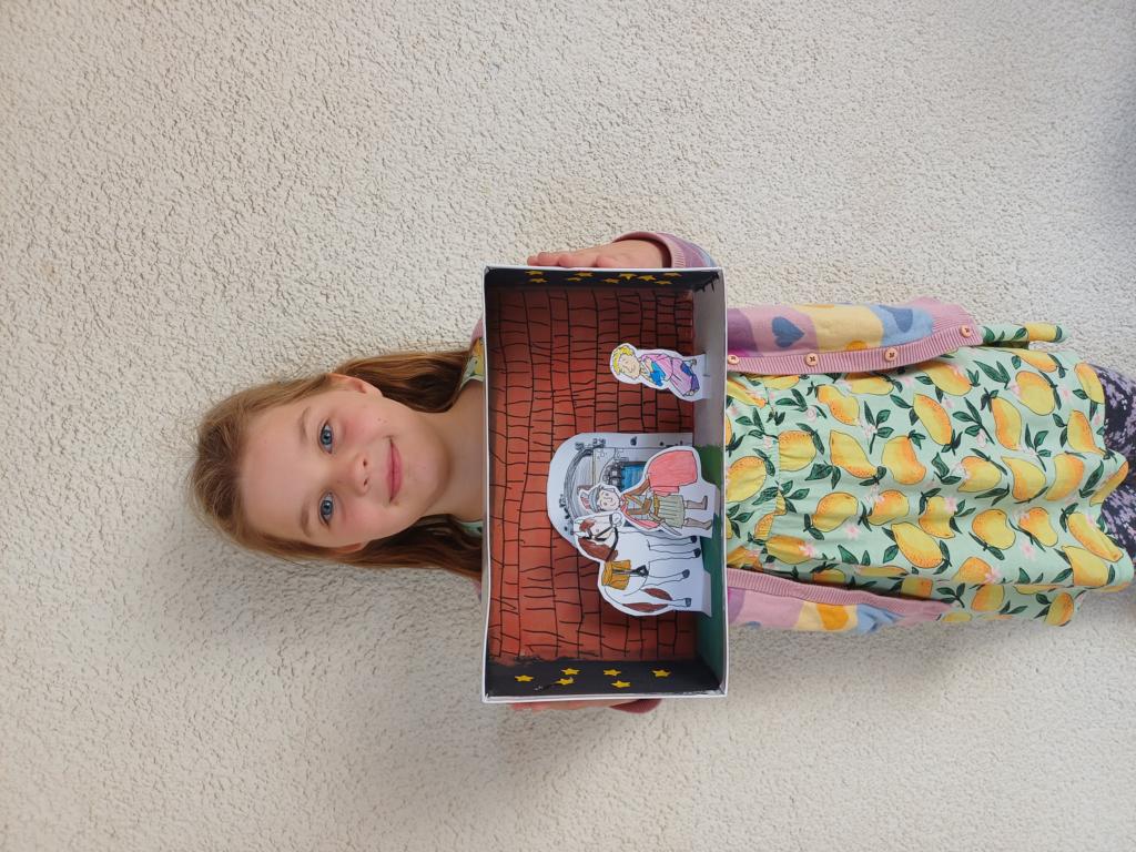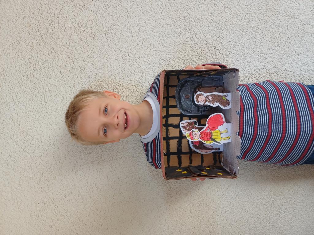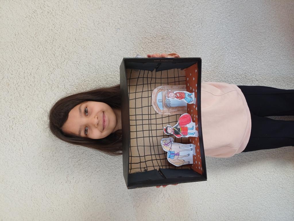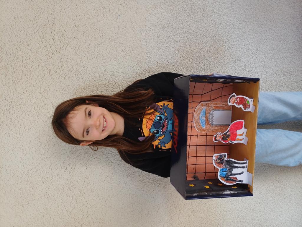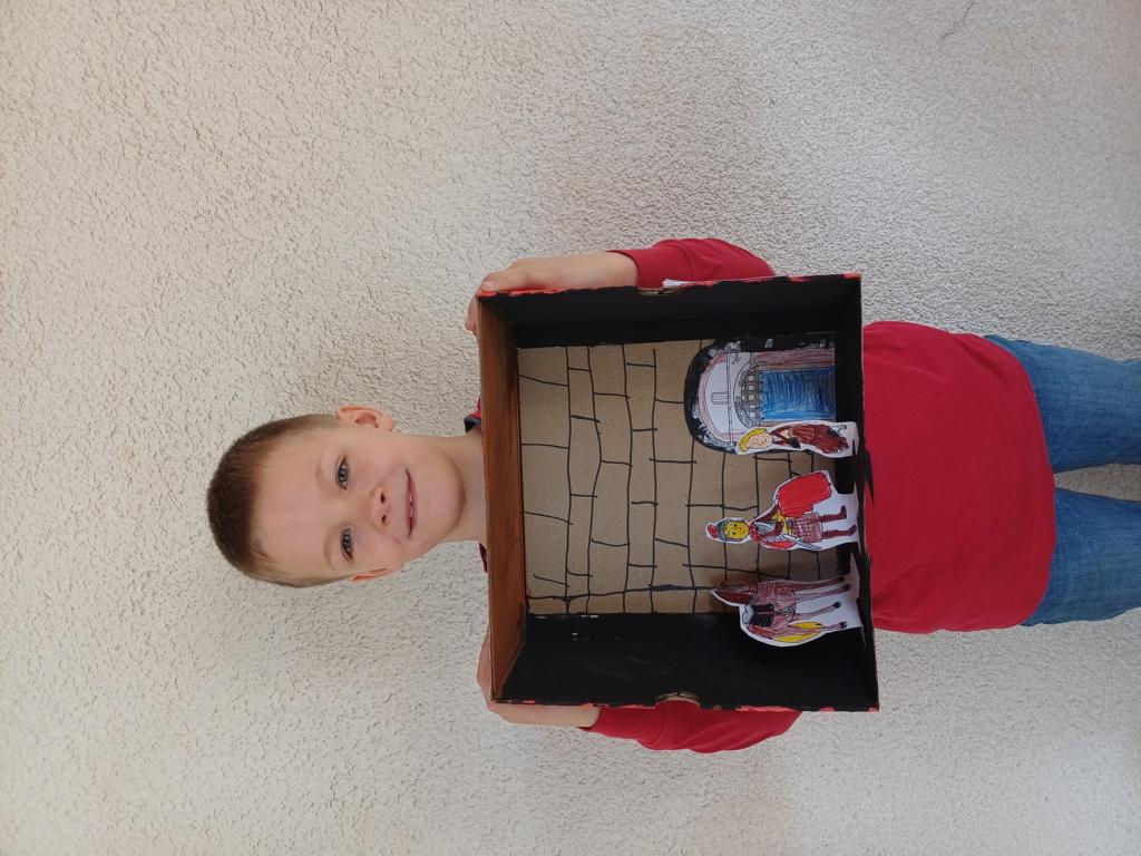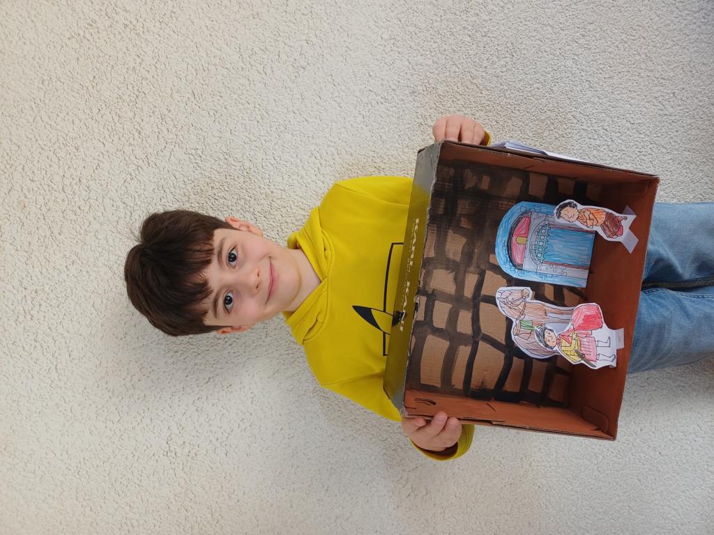 Passend zum Sankt-Martins-Fest haben die Kinder der 2c im Kunstunterricht Schuhkartons gestaltet. Der Bettler sitzt vor einer Stadtmauer und Sankt Martin teilt seinen Mantel. Liebevoll und ideenreich