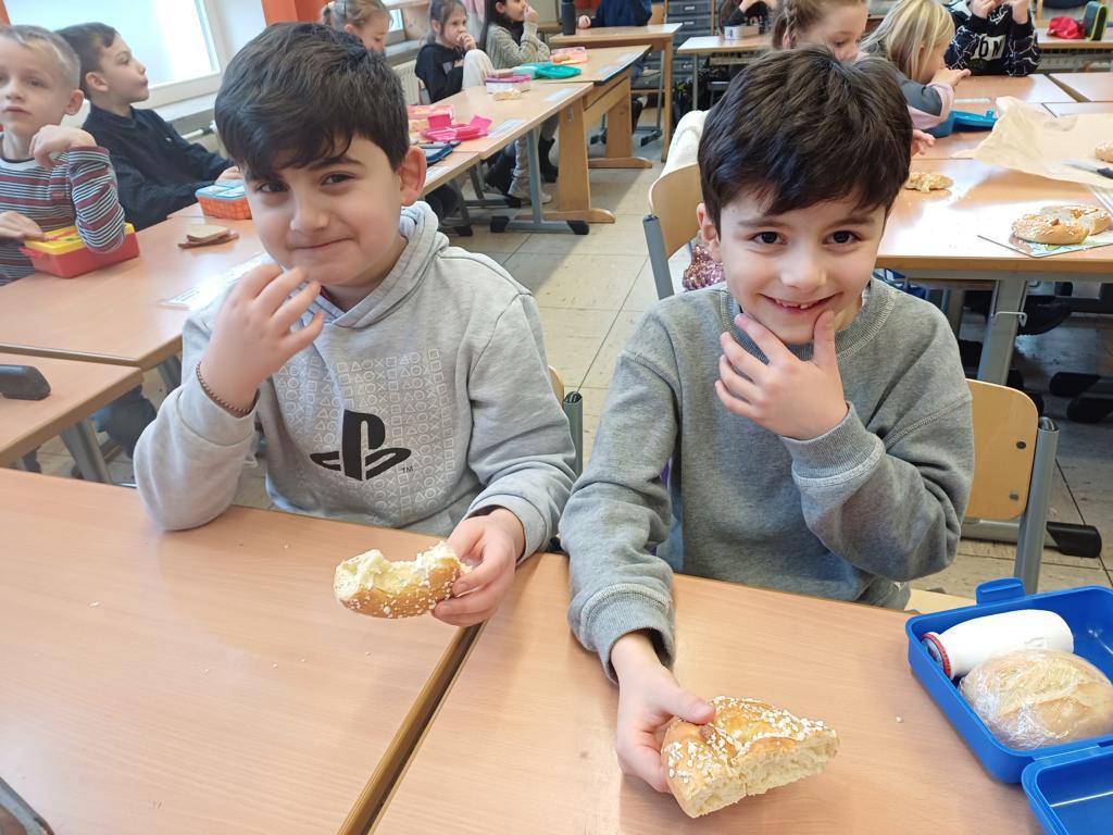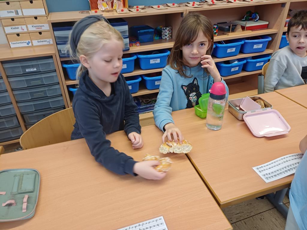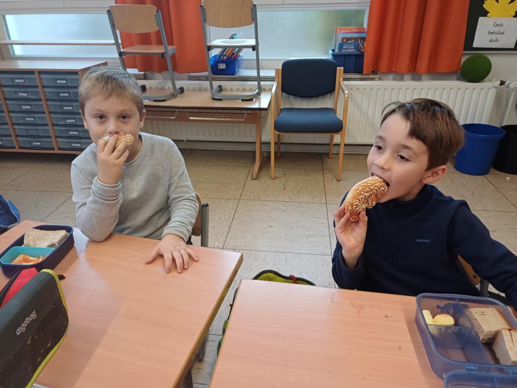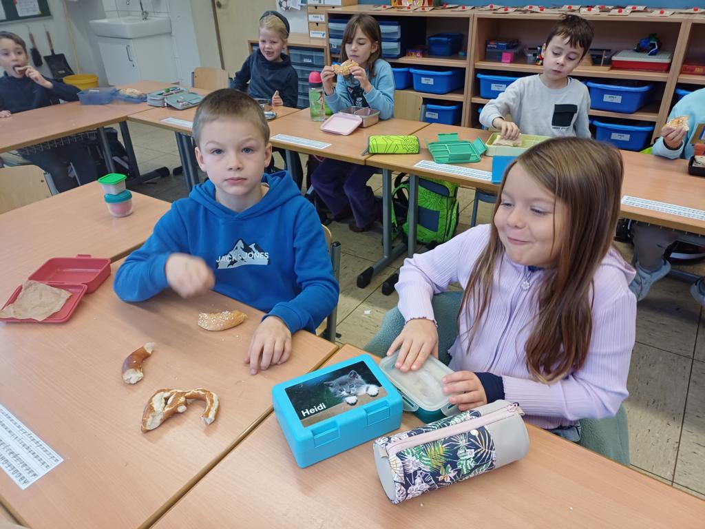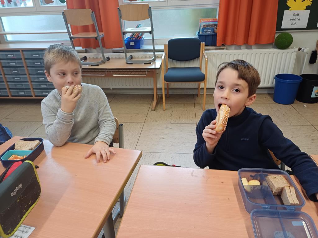 In dieser Woche feiern wir das Martinsfest. Am 14.11. sind wir dazu in die Kirche gegangen. Die Kinder aus den Klassen 3 haben den Gottesdienst vorbereitet. Nachdem wir wieder in der Klasse waren, bekamen immer zwei Kinder eine Martinsbrezel. Diese wurde gerecht geteilt.