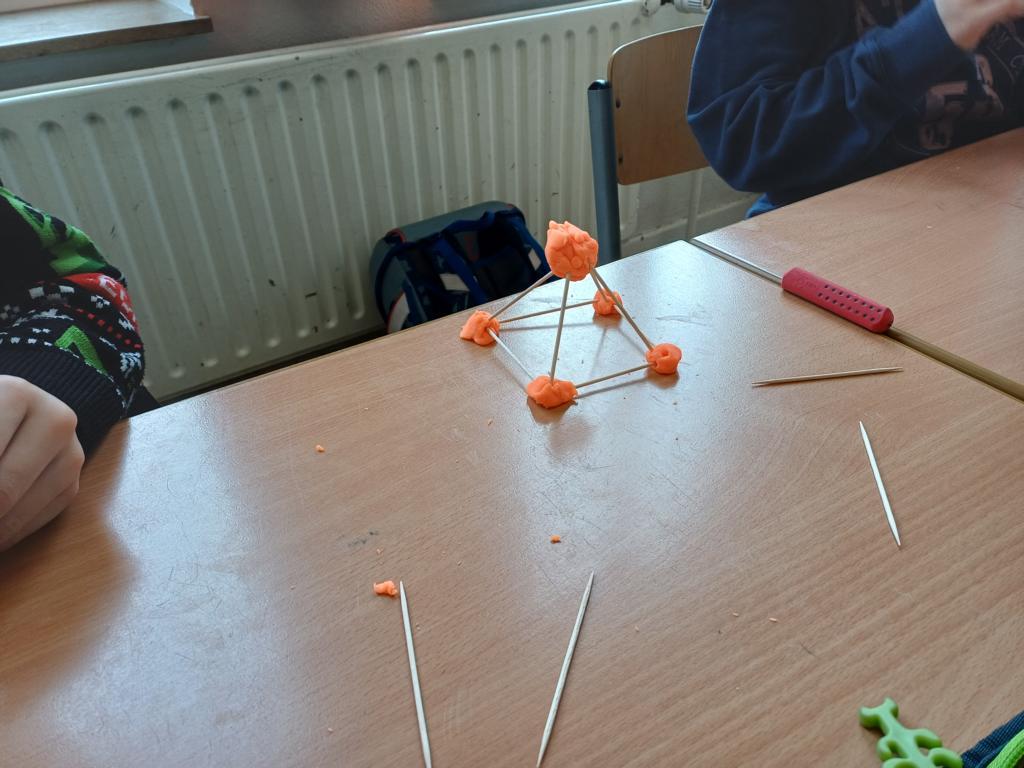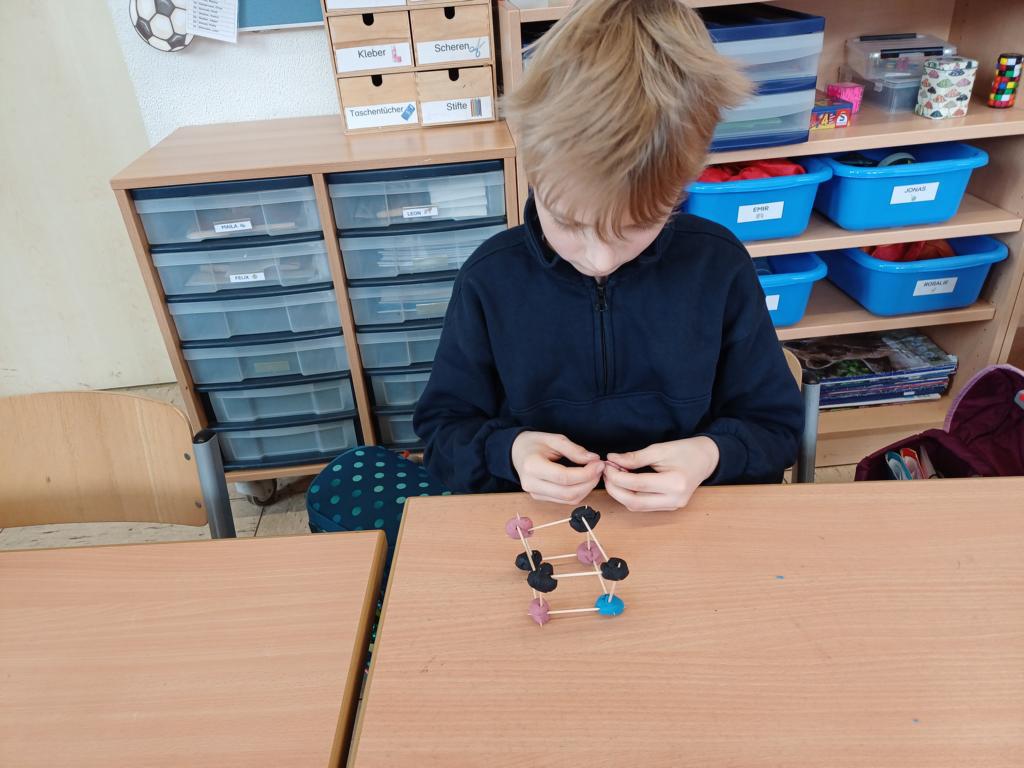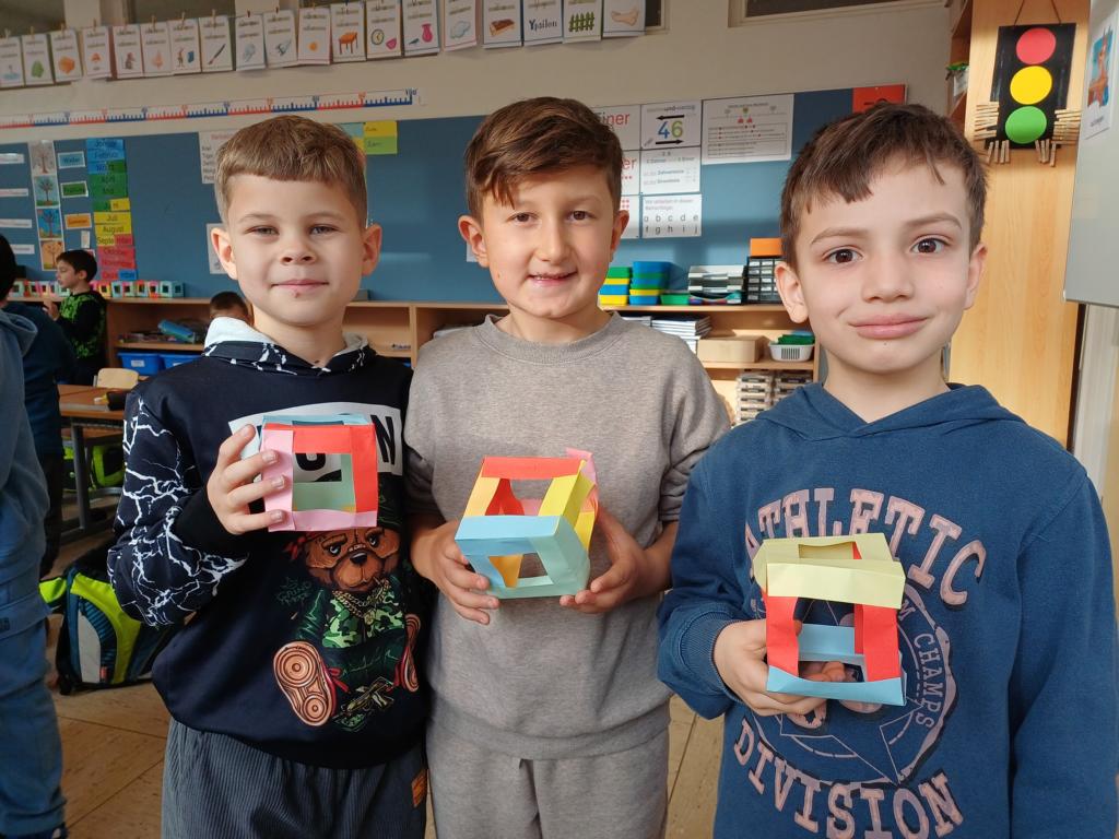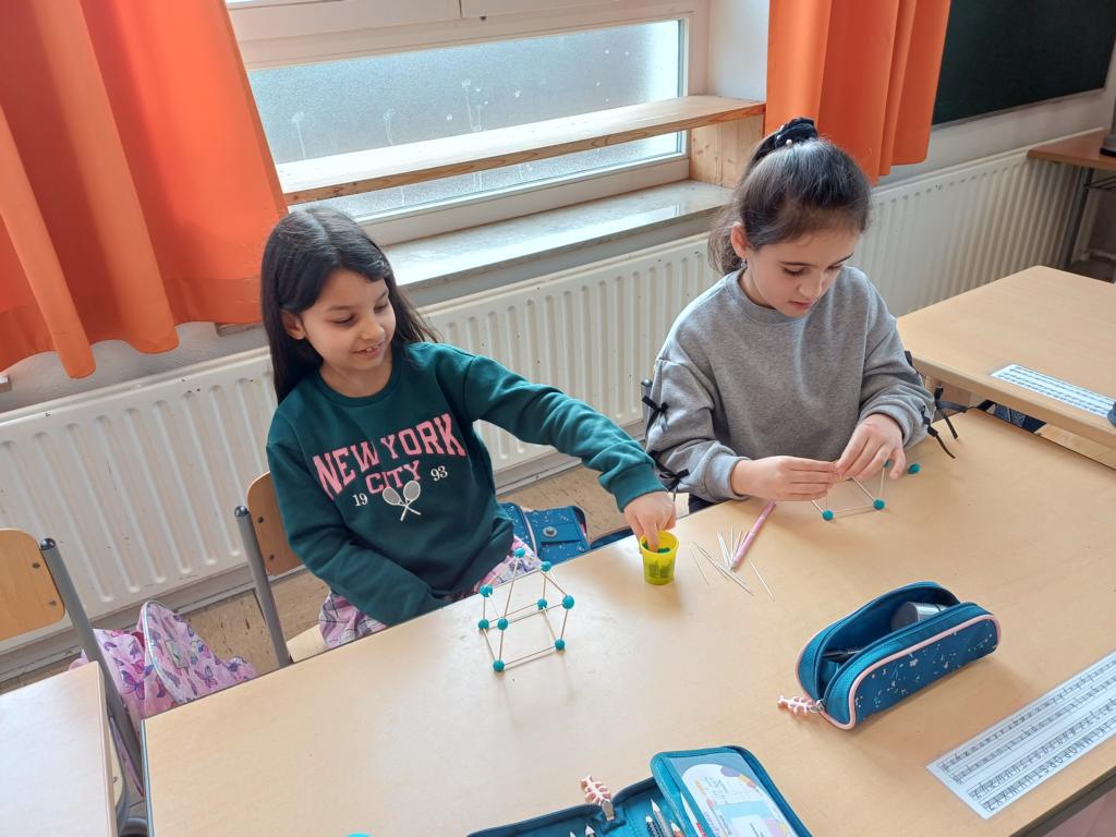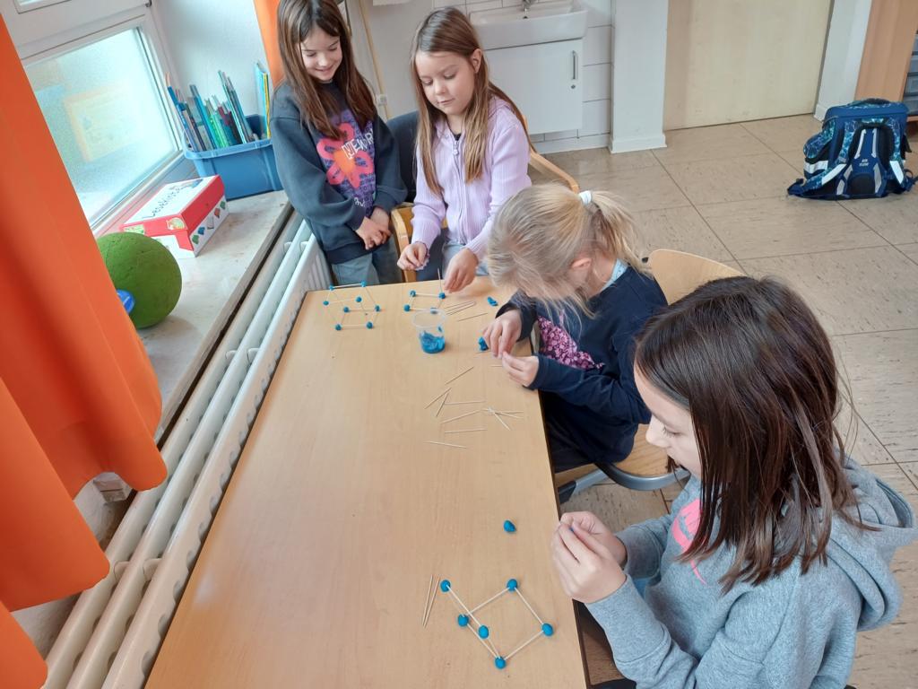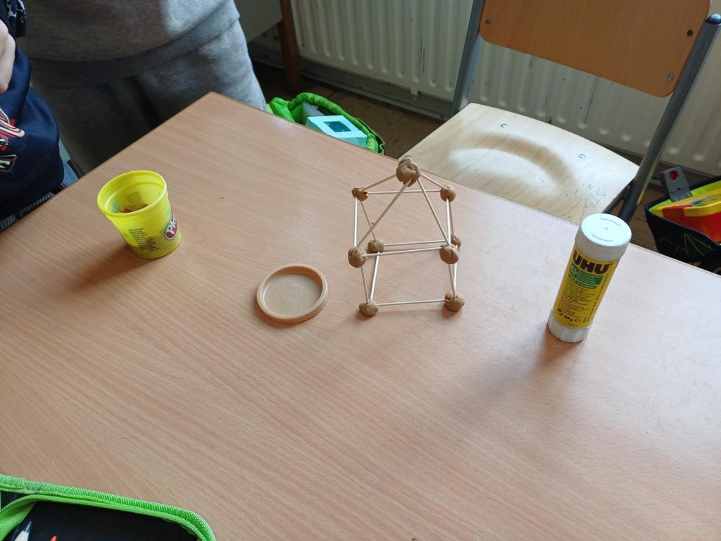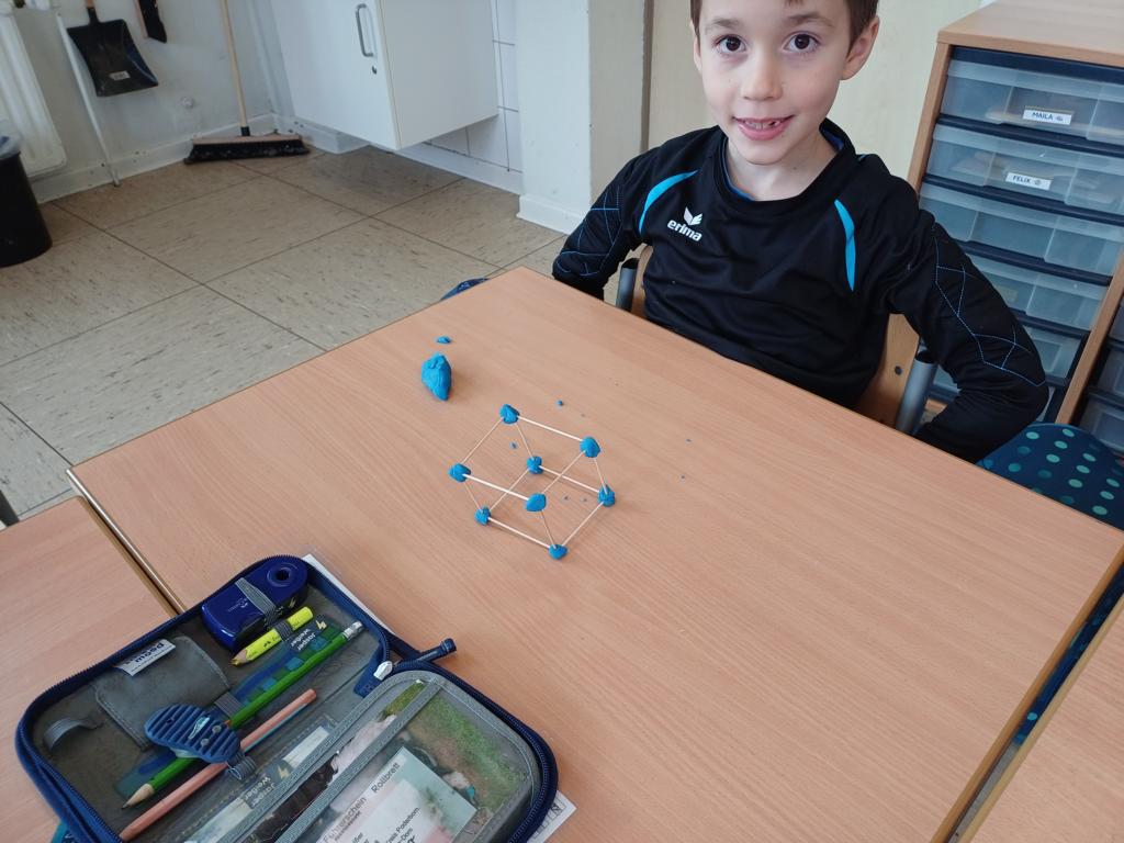 Wir haben die Körper in unserer Umwelt gesucht und viele Beispiel gefunden. Auch das Untersuchen der Körper auf ihre Flächen, Ecken und Kanten war für viele Kinder etwas Neues. Außerdem bauten wir Kantenmodelle aus Papier, Knete und Zahnstochern. Das haben wir prima hinbekommen und unser Wissen über den Quader und den Würfel vertieft.