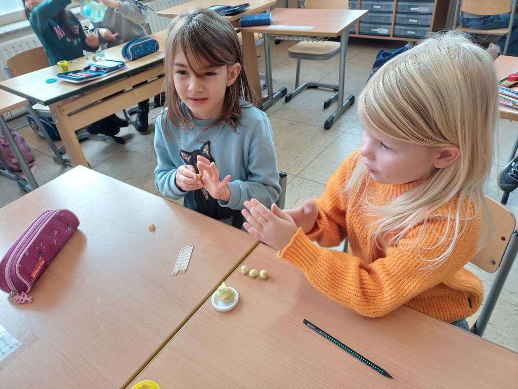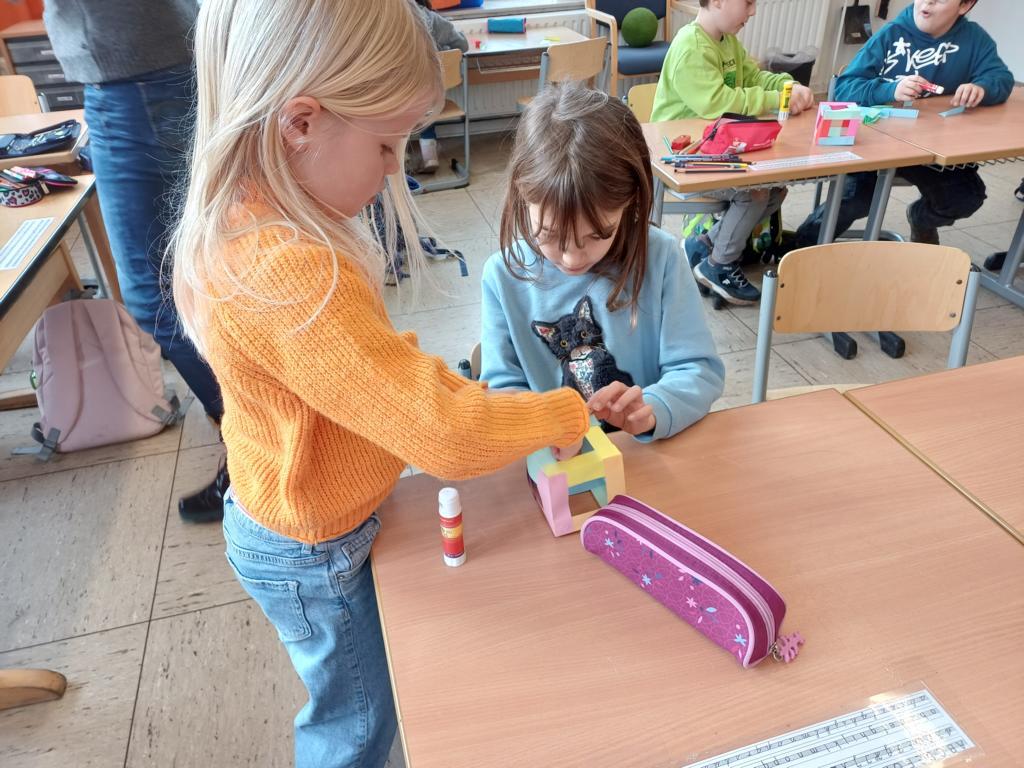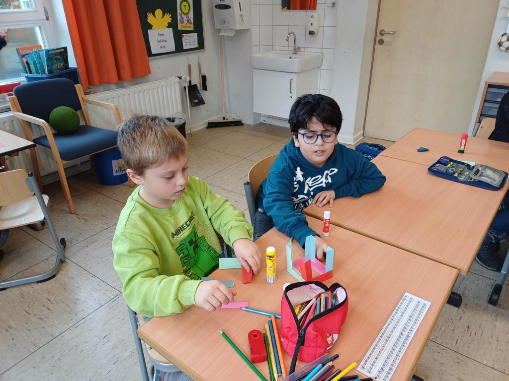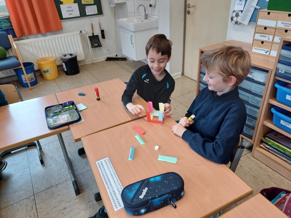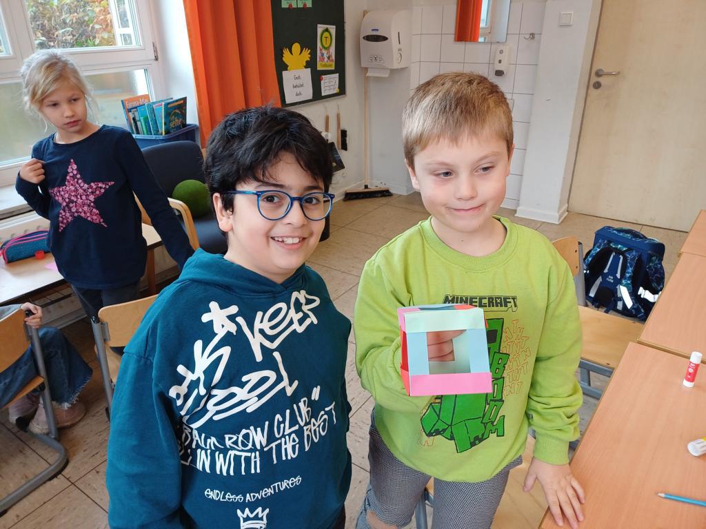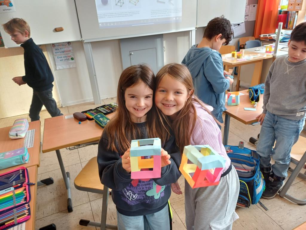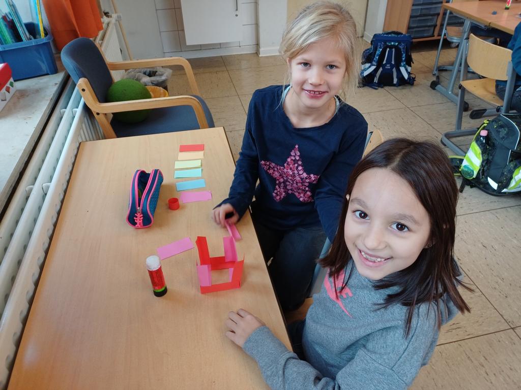 Wir haben die Körper in unserer Umwelt gesucht und viele Beispiel gefunden. Auch das Untersuchen der Körper auf ihre Flächen, Ecken und Kanten war für viele Kinder etwas Neues. Außerdem bauten wir Kantenmodelle aus Papier, Knete und Zahnstochern. Das haben wir prima hinbekommen und unser Wissen über den Quader und den Würfel vertieft.