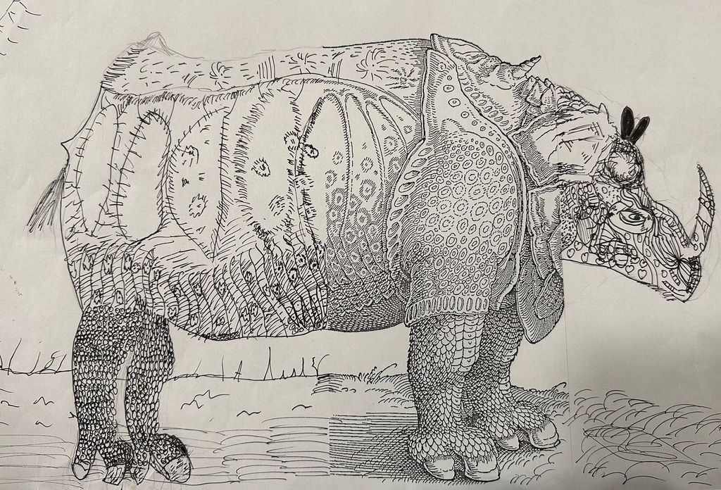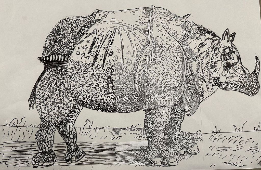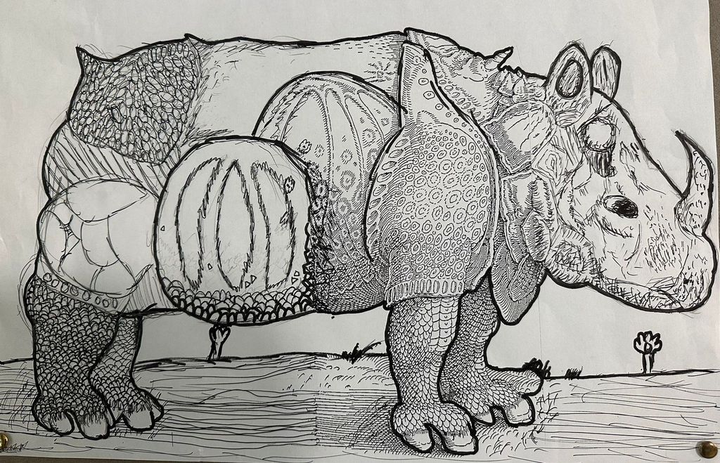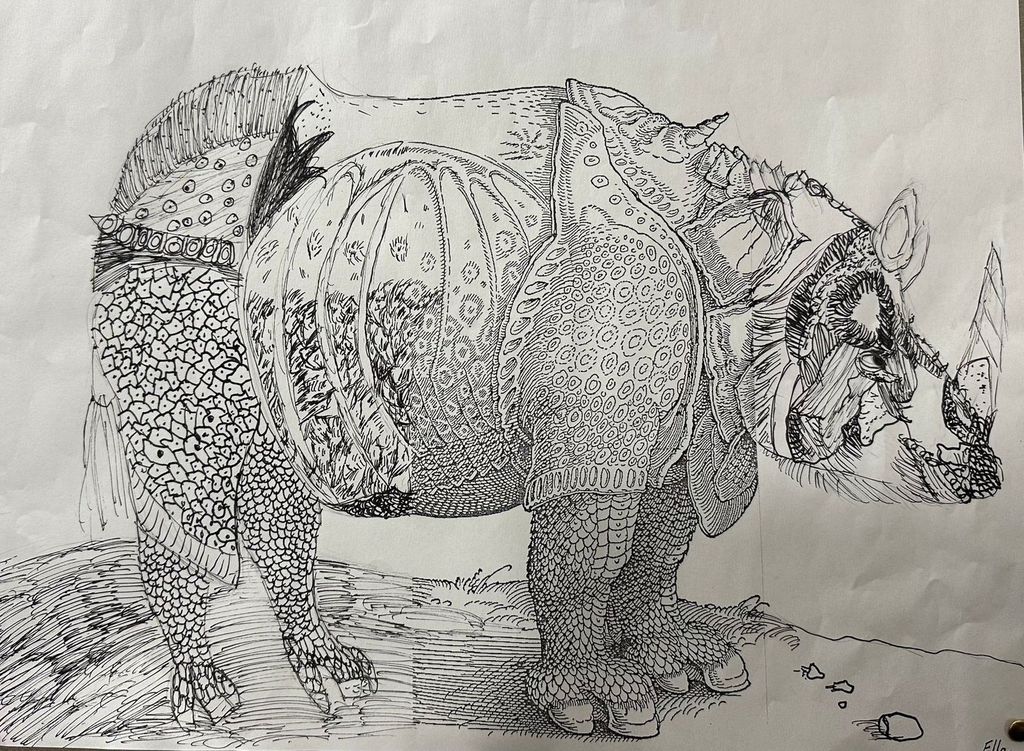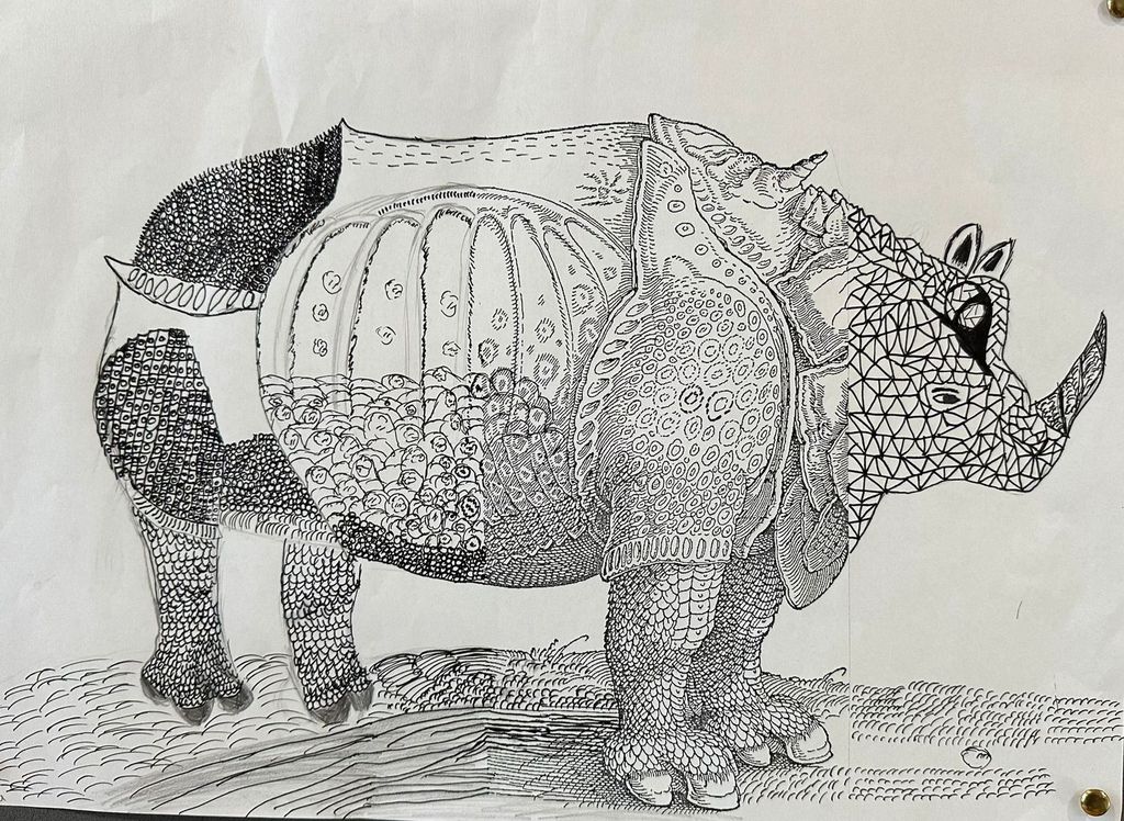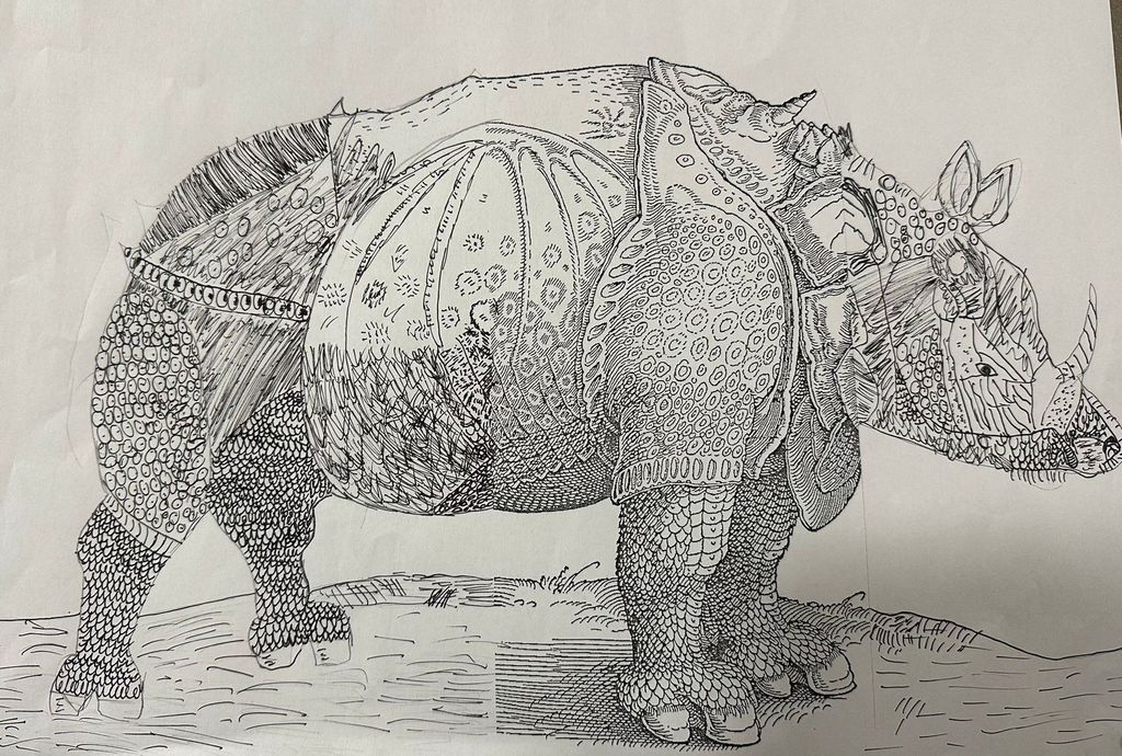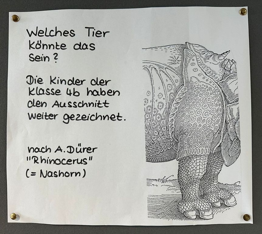 In Kunst haben wir uns mit dem Künstler Albrecht Dürer beschäftigt. Den Ausschnitt aus dem Bild „Rhinocerus“ haben wir weiter gezeichnet.