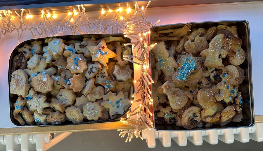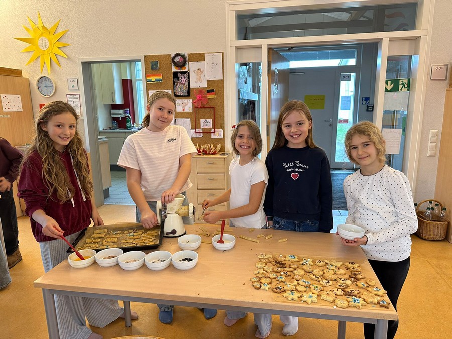 Am 9.12. haben wir einen Vormittag lang gebacken und gebastelt. Wir konnten drei große Dosen mit leckeren, bunten Plätzchen füllen! Als Tischdeko haben wir Schneemänner und Engel gebastelt.