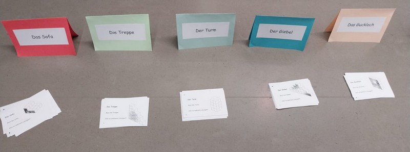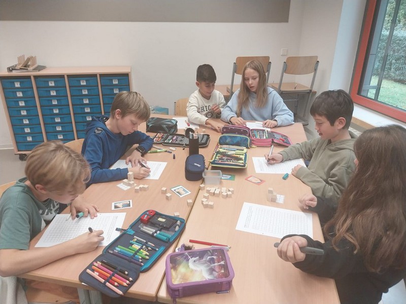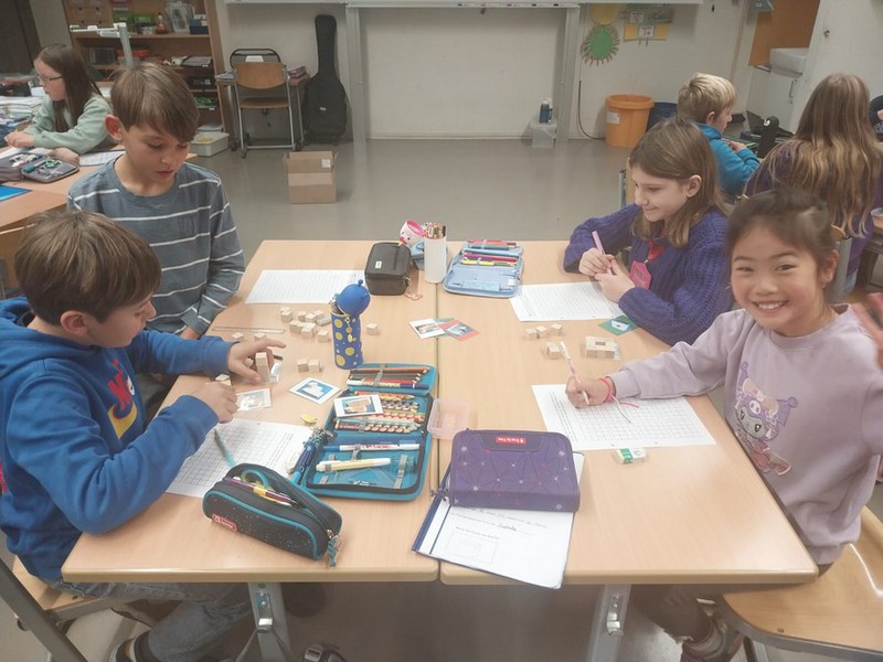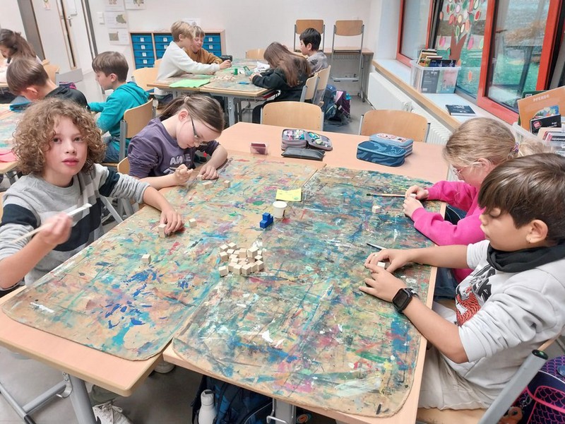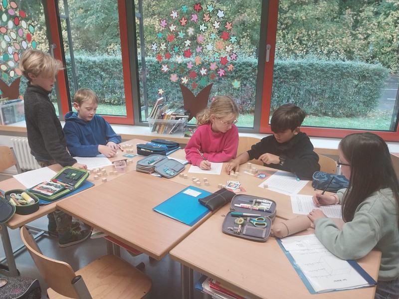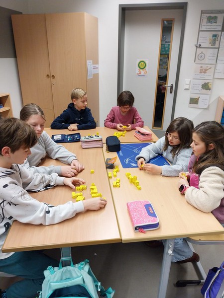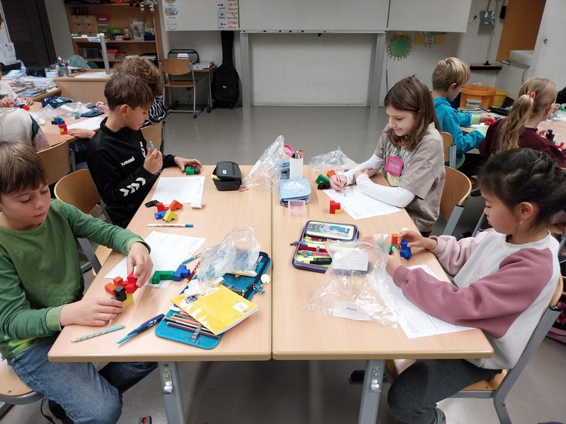 Nach den Herbstferien haben wir uns im Mathematikunterricht mit dem Soma-Würfel beschäftigt. Was dieser genau ist, mussten wir erst herausfinden. Deswegen haben wir erst nochmal die Merkmale eines Würfels besprochen und anschließend mit kleinen Würfeln Würfelgebäude mit Hilfe von Bauplänen nachgebaut und ebenfalls Baupläne geschrieben. Mit Steckwürfeln haben wir danach alle Möglichkeiten an Würfelgebäuden gebaut, die aus einem, zwei, drei oder vier Würfeln bestanden. Aus diesen haben wir dann welche aussortiert, die in einer geraden Linie aneinanderhingen. Somit blieben nur noch die sieben Bausteine des Soma-Würfels übrig. Mit kleinen Holzwürfeln haben wir diese dann nachgebaut und mit Holzleim festgeklebt. Hinterher haben wir sie mit Acrylfarbe angemalt, um dann damit bauen zu können. Erst haben wir eigene Gebäude gebaut und dazu Baupläne aufgeschrieben, sodass andere Kinder sie nachbauen sollten. Danach haben wir zwölf verschiedene andere Gebäude bekommen, die wir selbst nachbauen sollten. Wir hatten zwar viele Tipp-Karten, aber konnten herausfinden, dass wir diese eigentlich nicht wirklich brauchten. Somit haben wir erst immer alle einzelnen Würfel gezählt und wussten, wenn die Anzahl ungerade ist, brauchen wir den Dreier und ist die Anzahl gerade, dann dürfen wir diesen nicht benutzen. Zudem war klar, ist das Gebäude „flach“, also kann man es so auf den Tisch legen, dann brauchen wir die drei Steine nicht, die jeweils an einer Stelle einen zweiten Würfel aufeinander kleben haben. So gelang es uns, alle Gebäude nachzubauen, aber natürlich mussten wir auch ausprobieren, wie die Bausteine zu setzen sind. Unsere Ergebnisse haben wir dann auf der Abbildung farbliche entsprechend dargestellt. Ganz am Ende haben alle Kinder den Soma-Würfel gebaut, sodass er wie ein großer Würfel aussah. Dafür gibt es sogar 240 Möglichkeiten! Auch für zu Hause haben wir noch ein Heft mit neuen Aufgaben bekommen und können diesen nun auch weiterhin nutzen, weil es so viel Spaß gemacht hat!